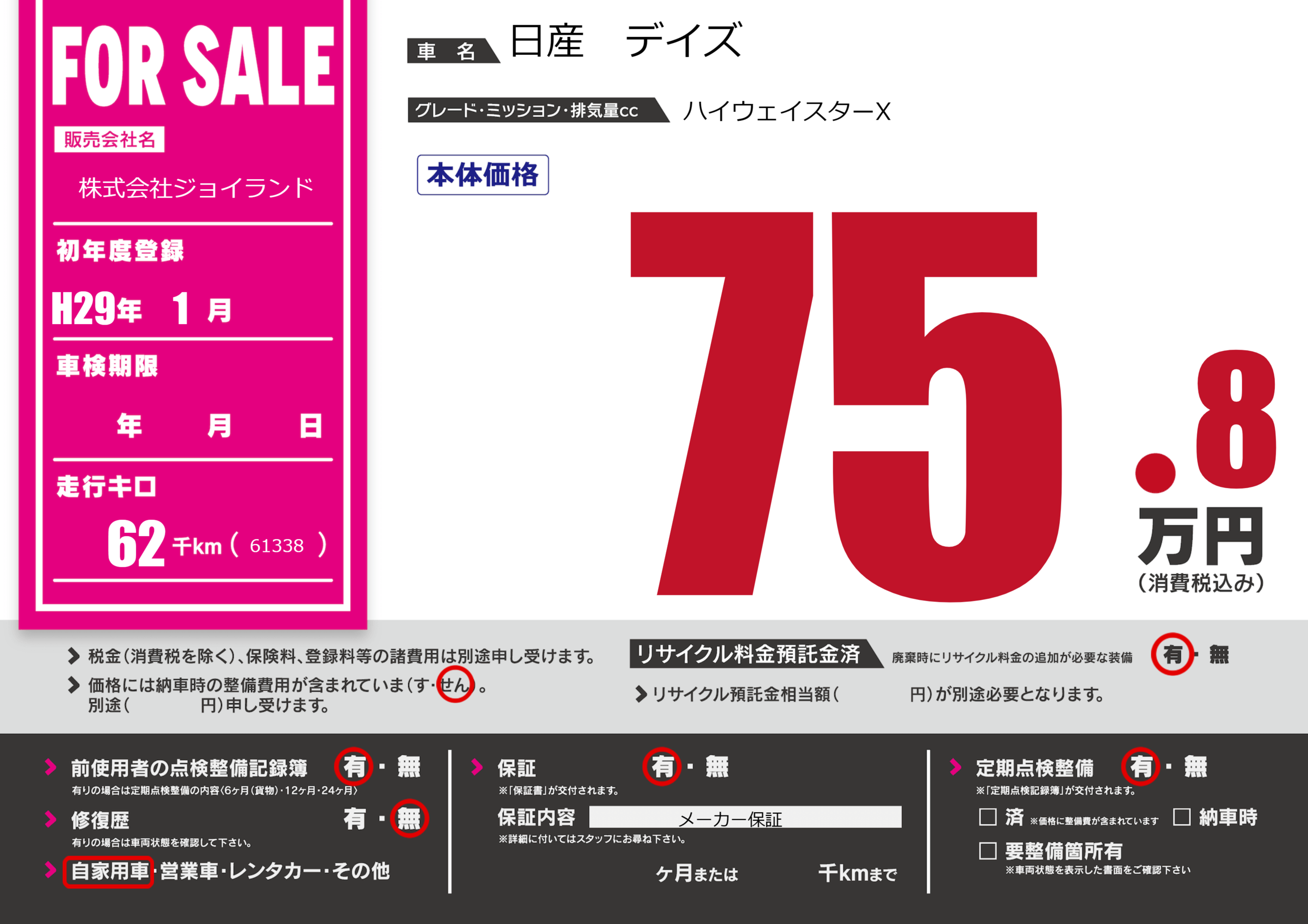 | 車名 | 日産 デイズ | グレード ミッション 排気量 |