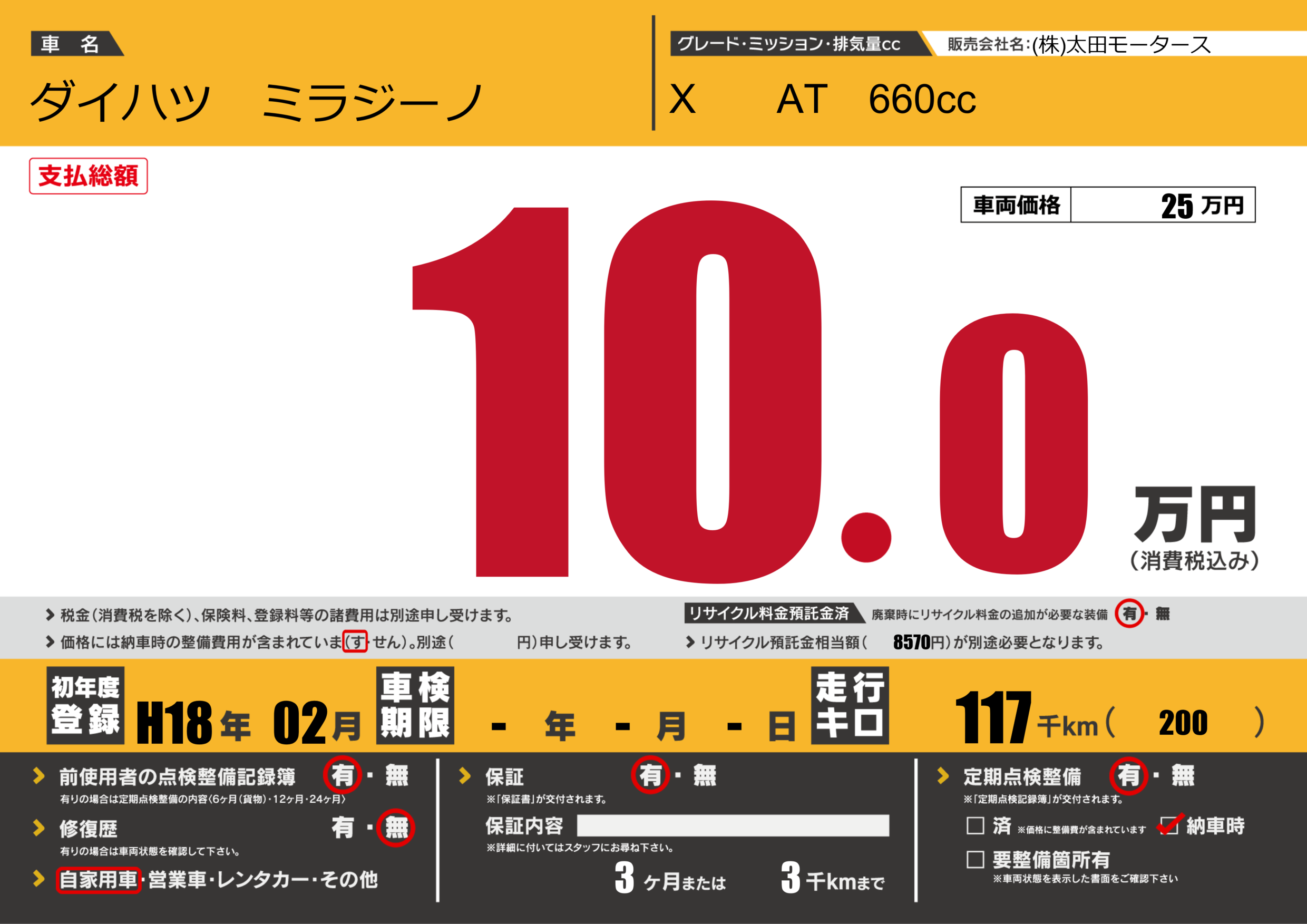 | 定期点検整備 | 定期点検整備あり 納車時あり | ||