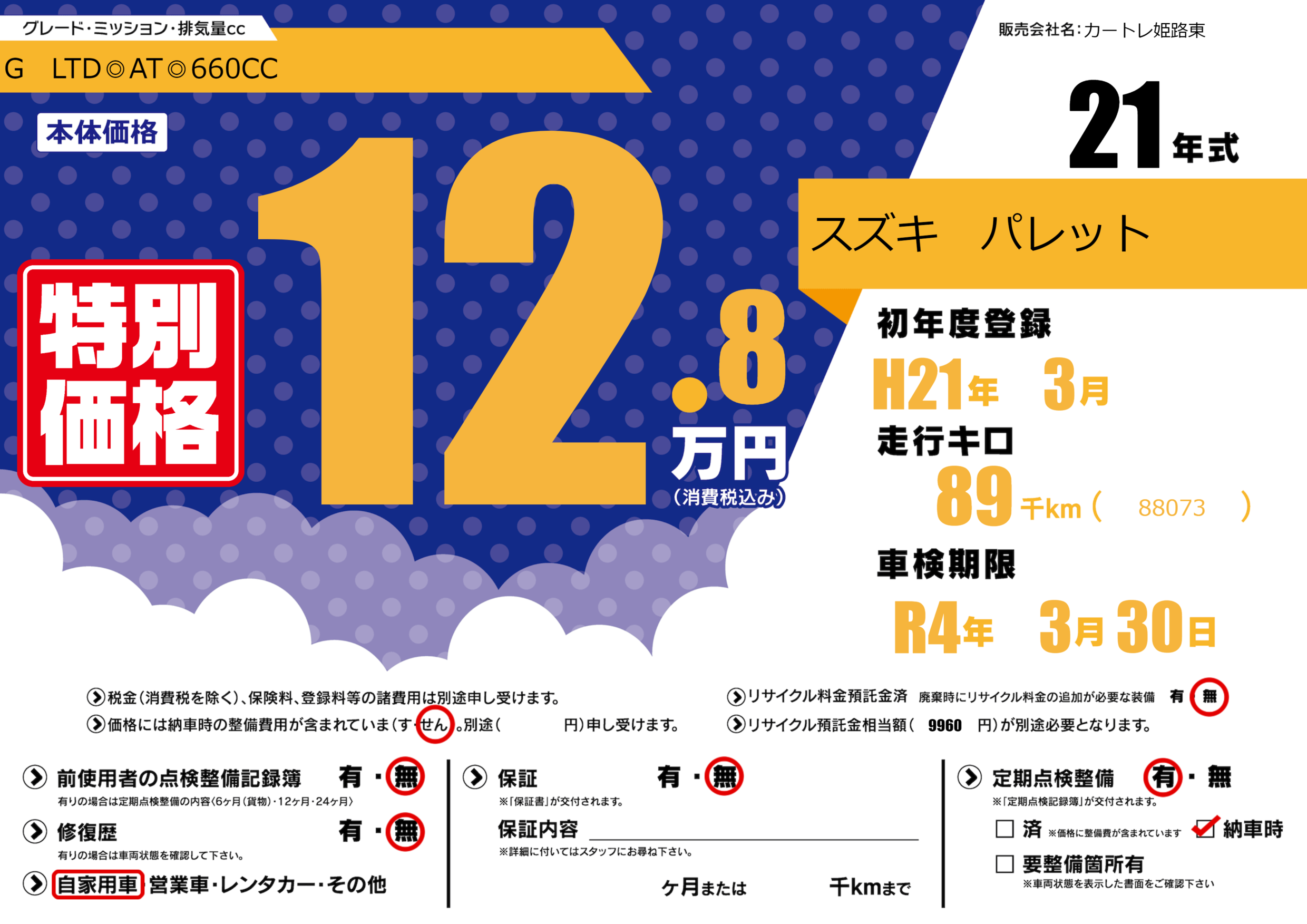 | 車名 | スズキ パレット | グレード ミッション 排気量 |