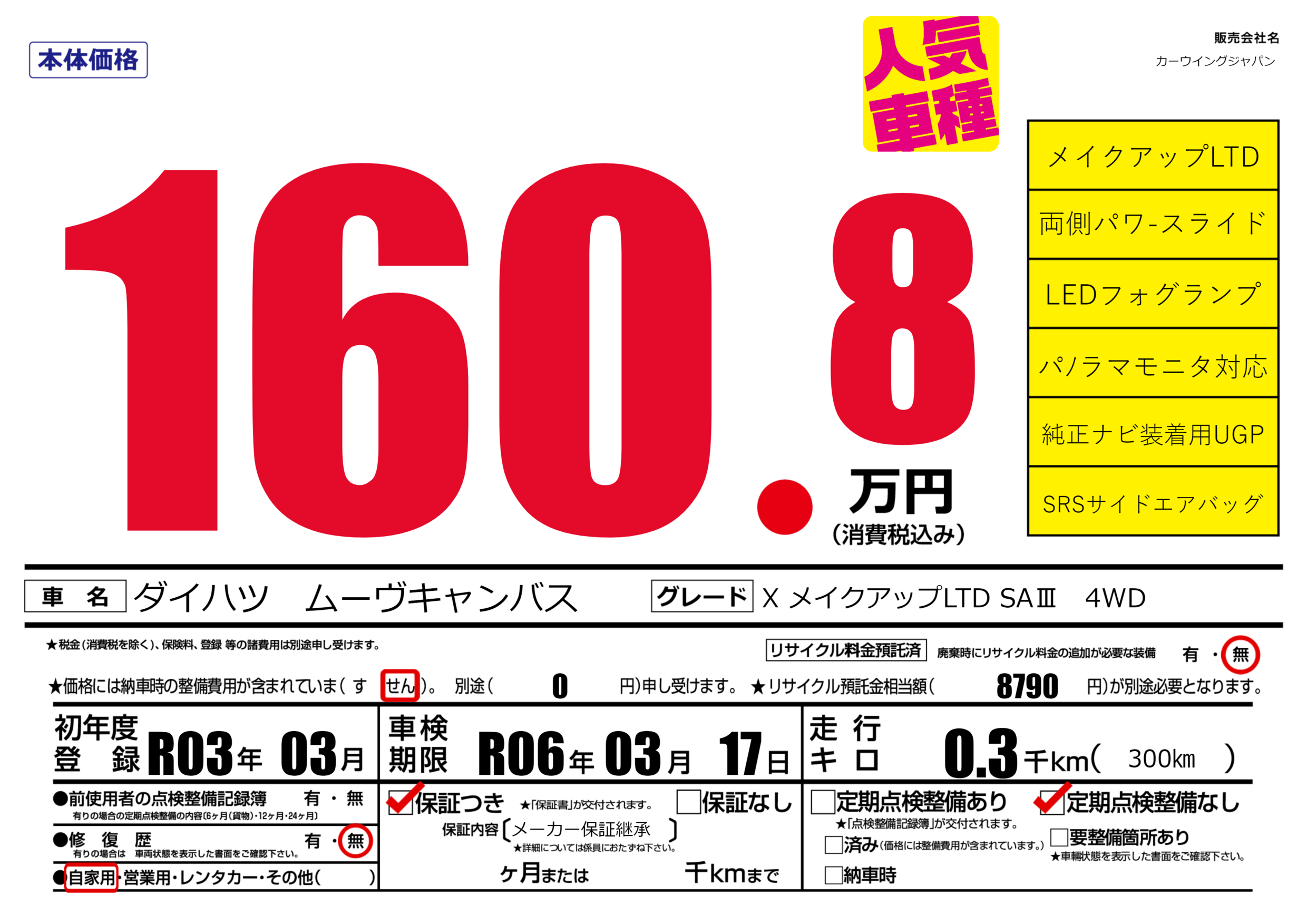 保証付き 保証内容(メーカー保証継承) ---ヶ月または()千kmまで |