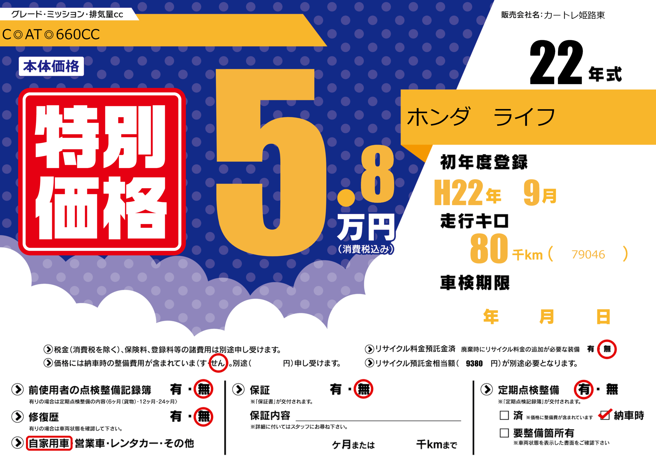 | 走行キロ | 8万km | 初年度登録 | H22年9月 |