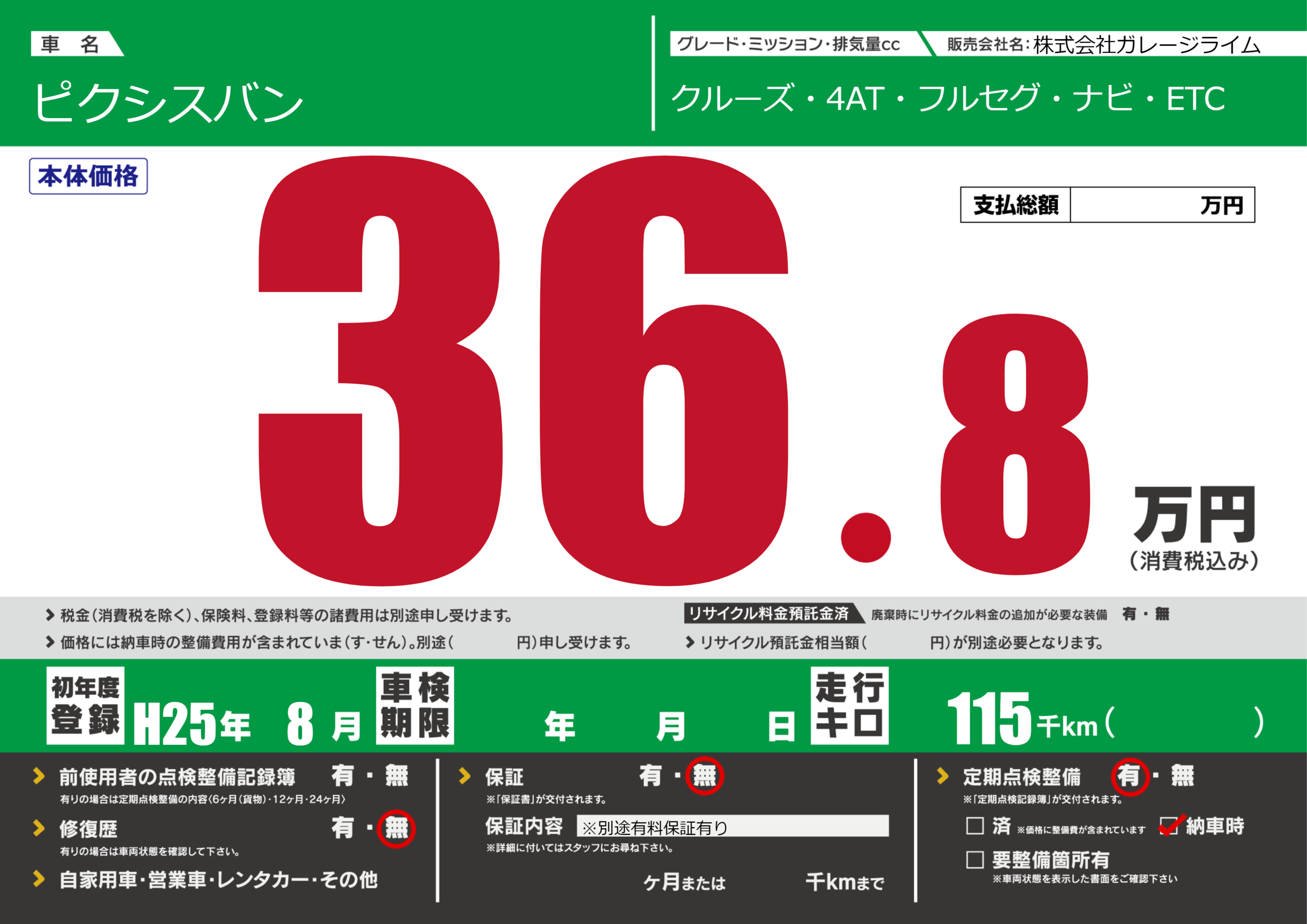 | 定期点検整備 | 定期点検整備あり 納車時あり | ||