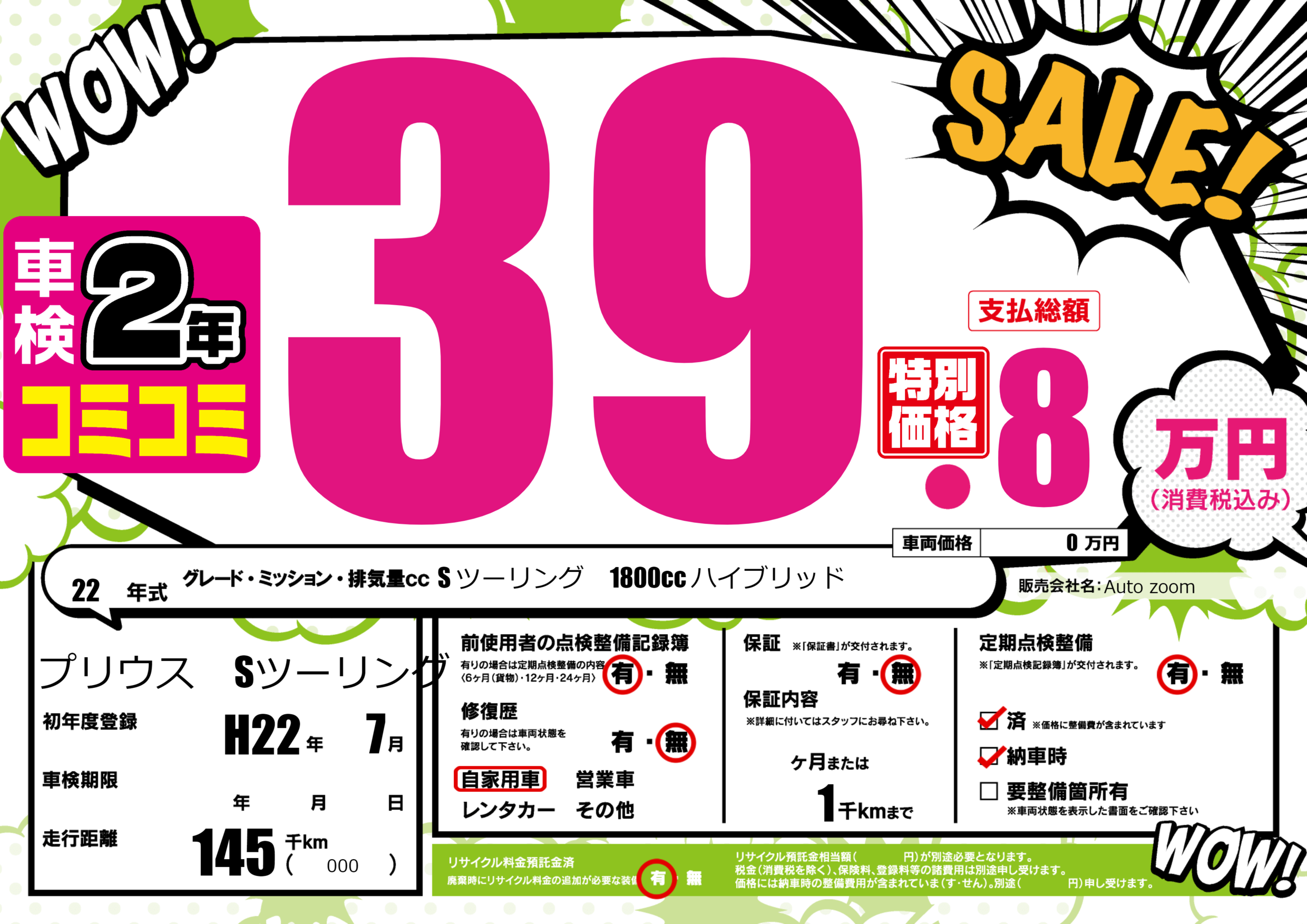 | 走行キロ | 14.5万km | 初年度登録 | H22年7月 |
