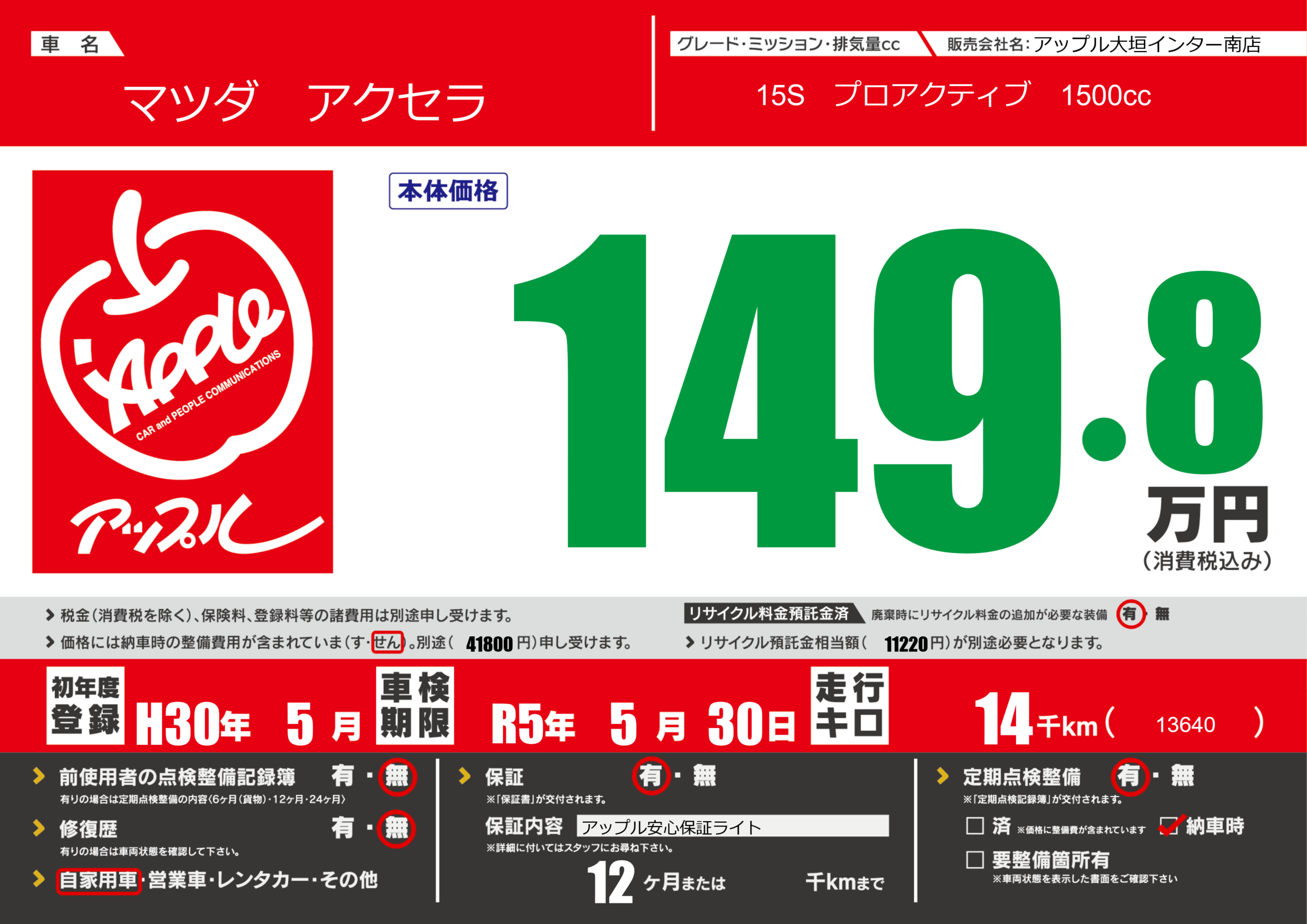 保証付き 保証内容(アップル安心保証ライト) 12ヶ月または()千kmまで |