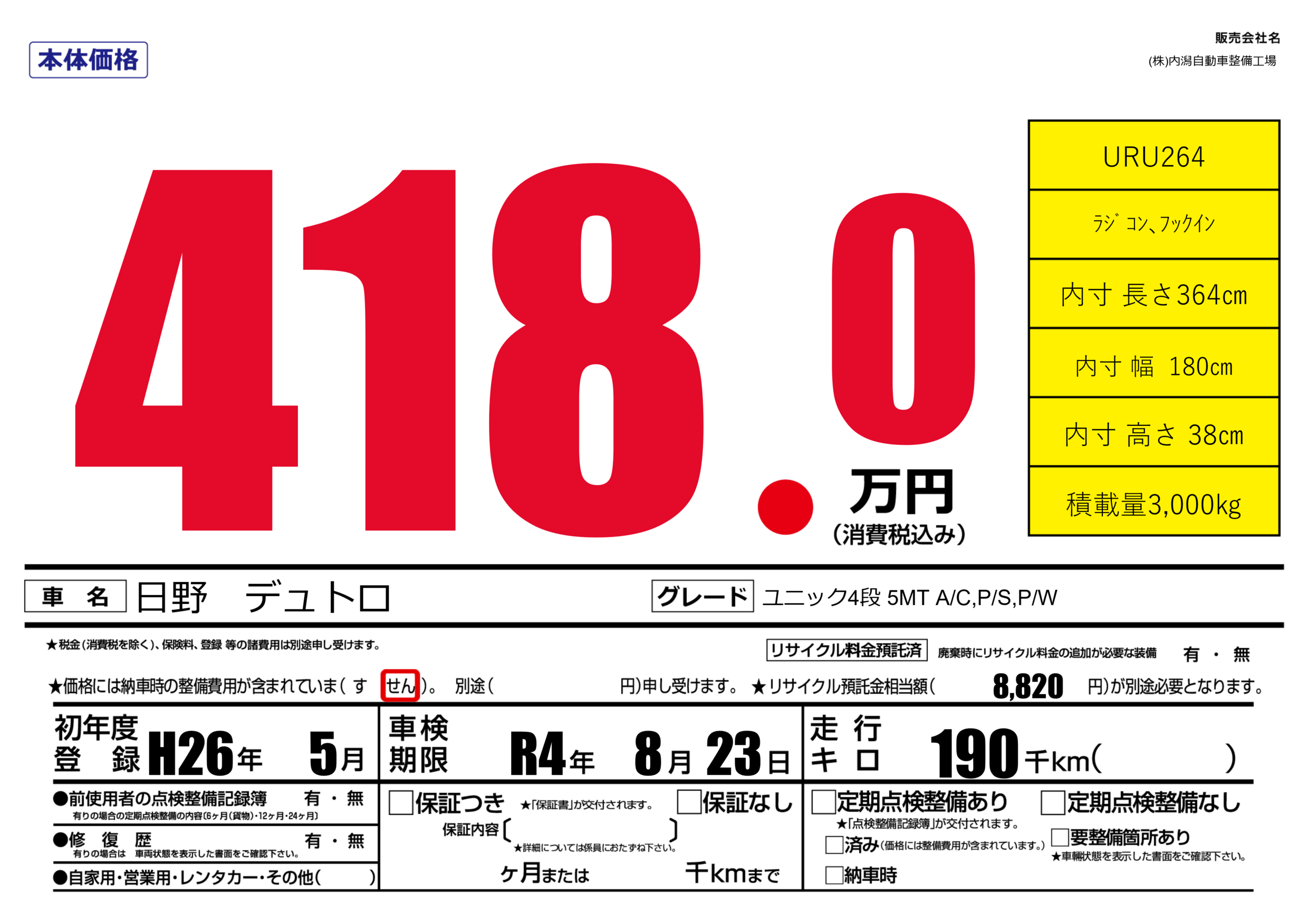 | 車名 | 日野 デュトロ | グレード ミッション 排気量 |