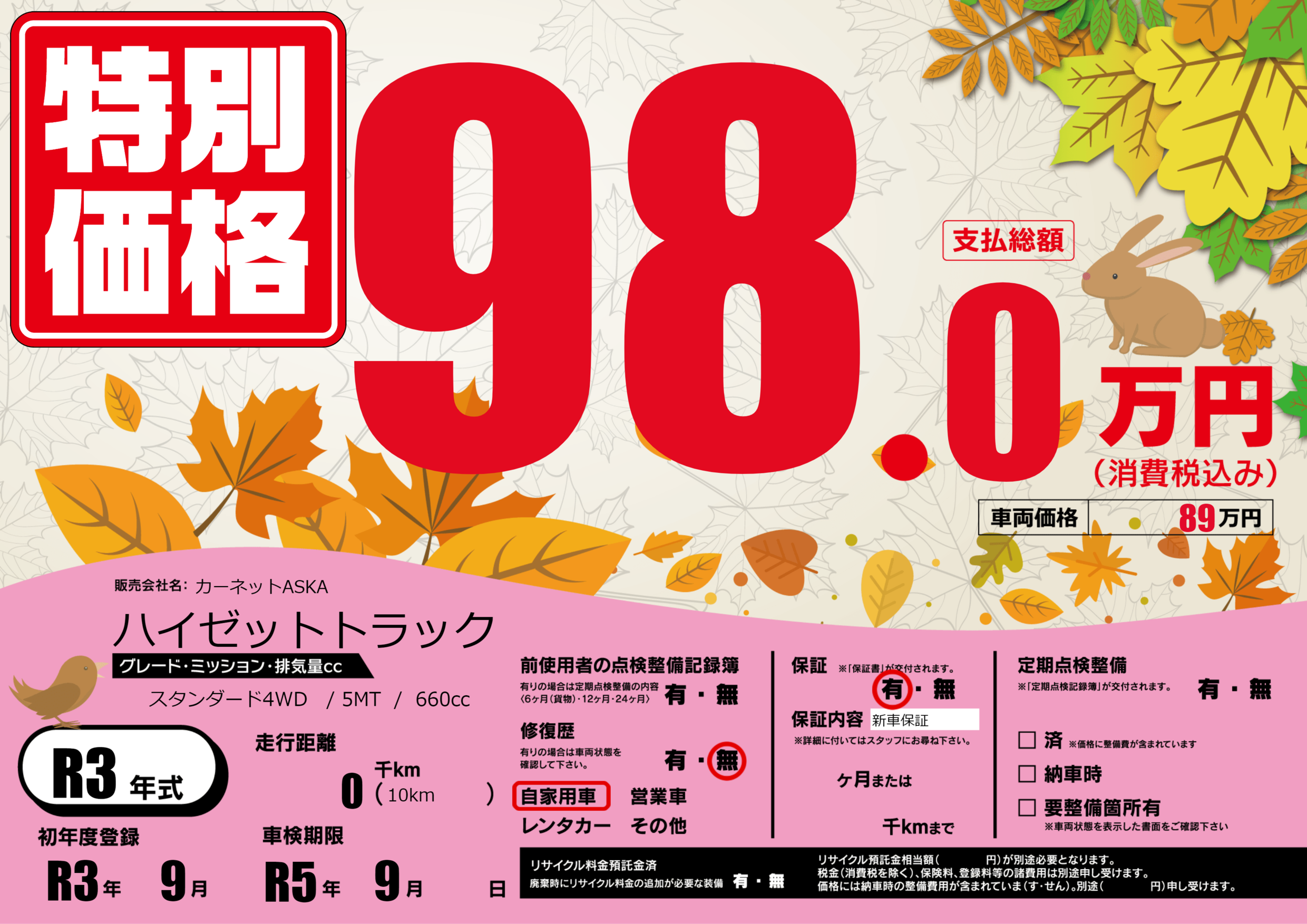 | 車名 | ハイゼットトラック | グレード ミッション 排気量 |
