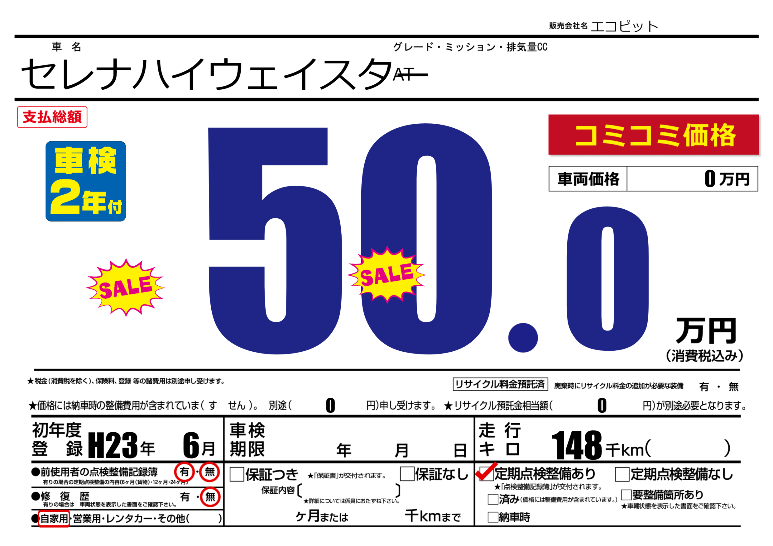 | 走行キロ | 14.8万km | 初年度登録 | H23年6月 |