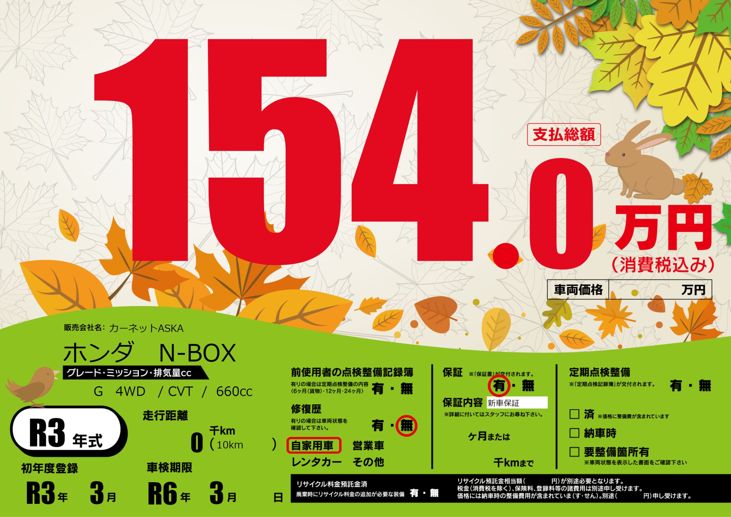 | 車名 | ホンダ N-BOX | グレード ミッション 排気量 |