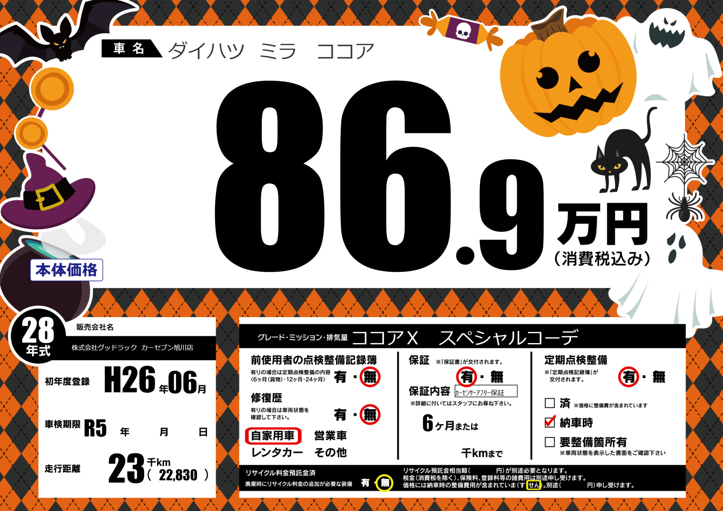 | 走行キロ | 2.3万km | 初年度登録 | H26年06月 |