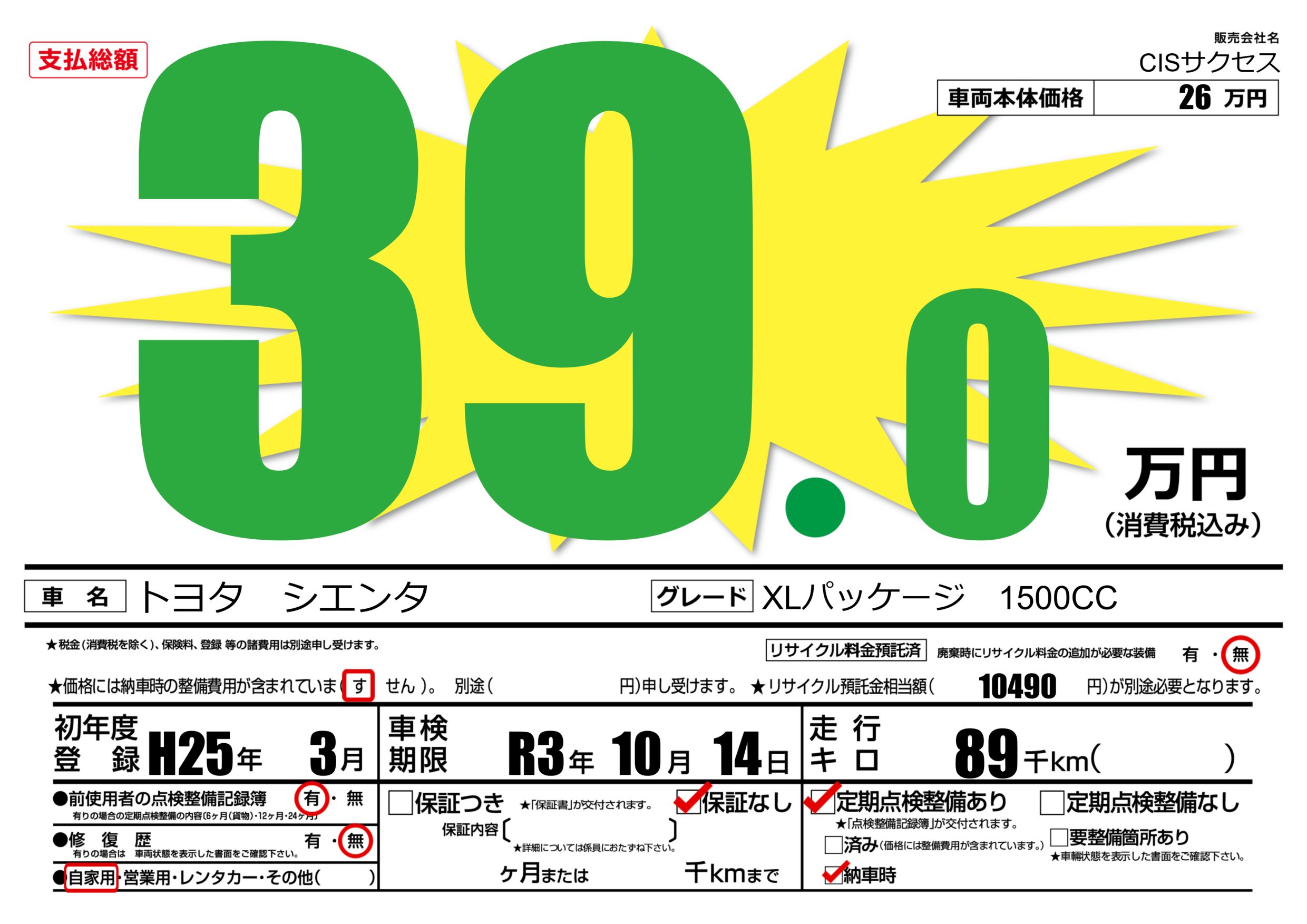 | 車名 | トヨタ シエンタ | グレード ミッション 排気量 |