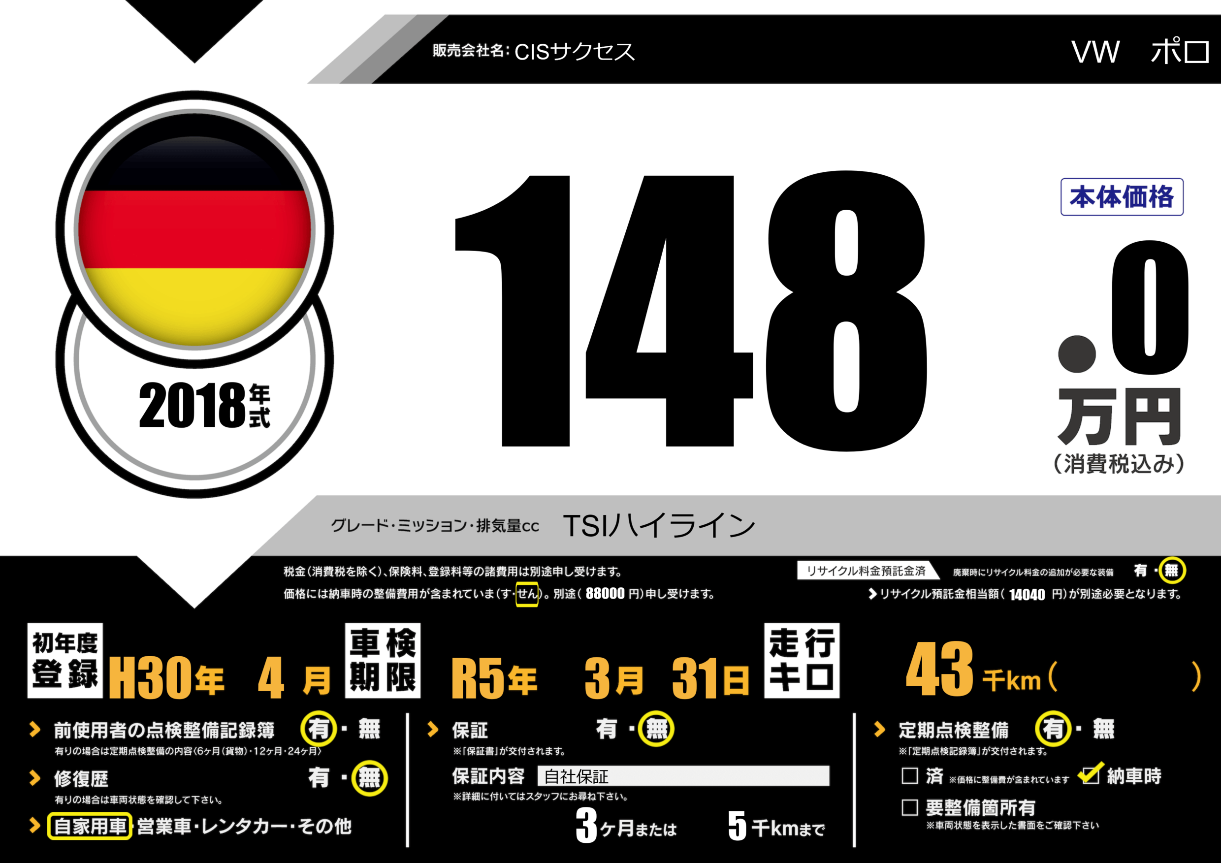 | 車名 | VW ポロ | グレード ミッション 排気量 |
