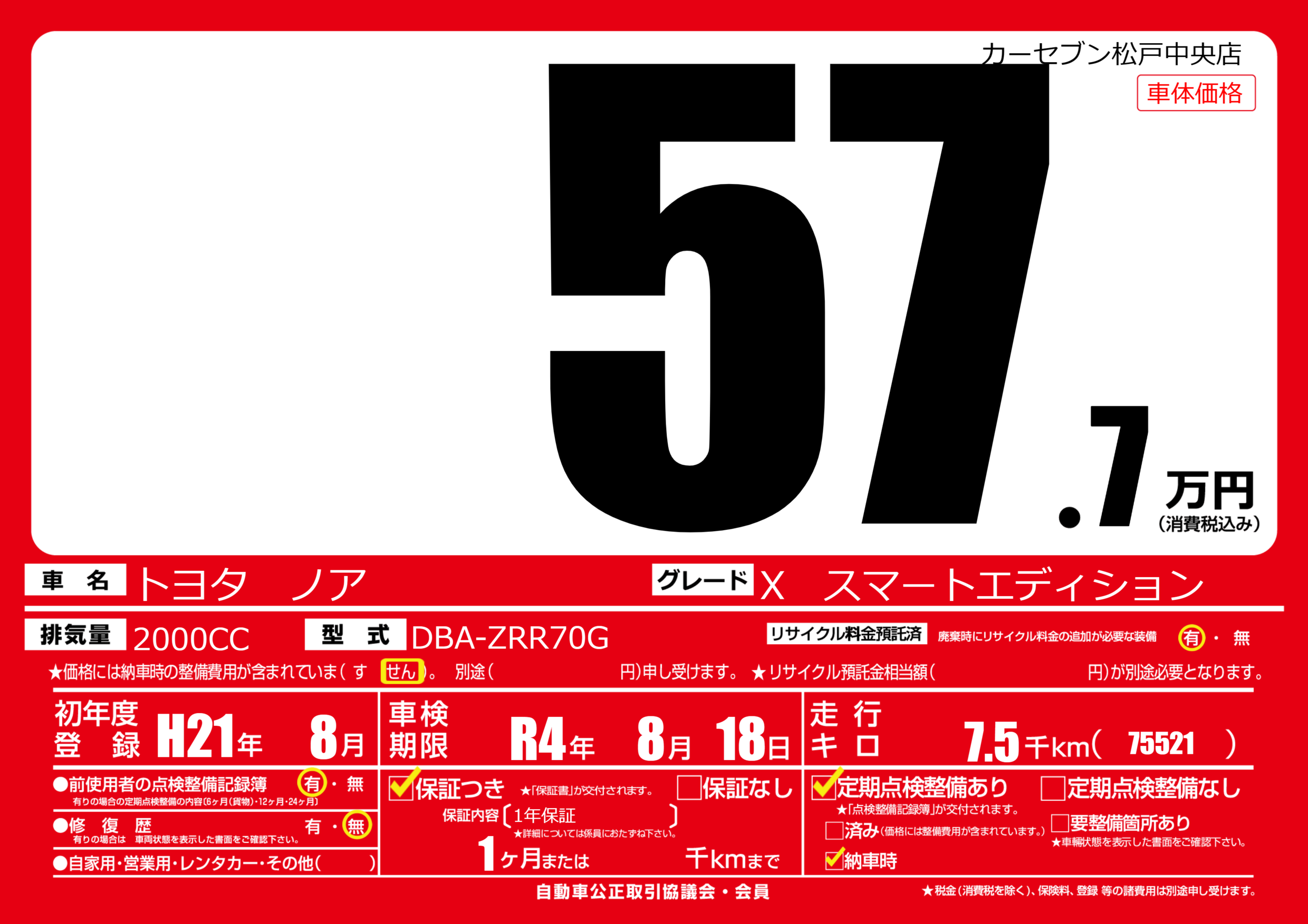 | 車名 | トヨタ ノア | グレード ミッション 排気量 |
