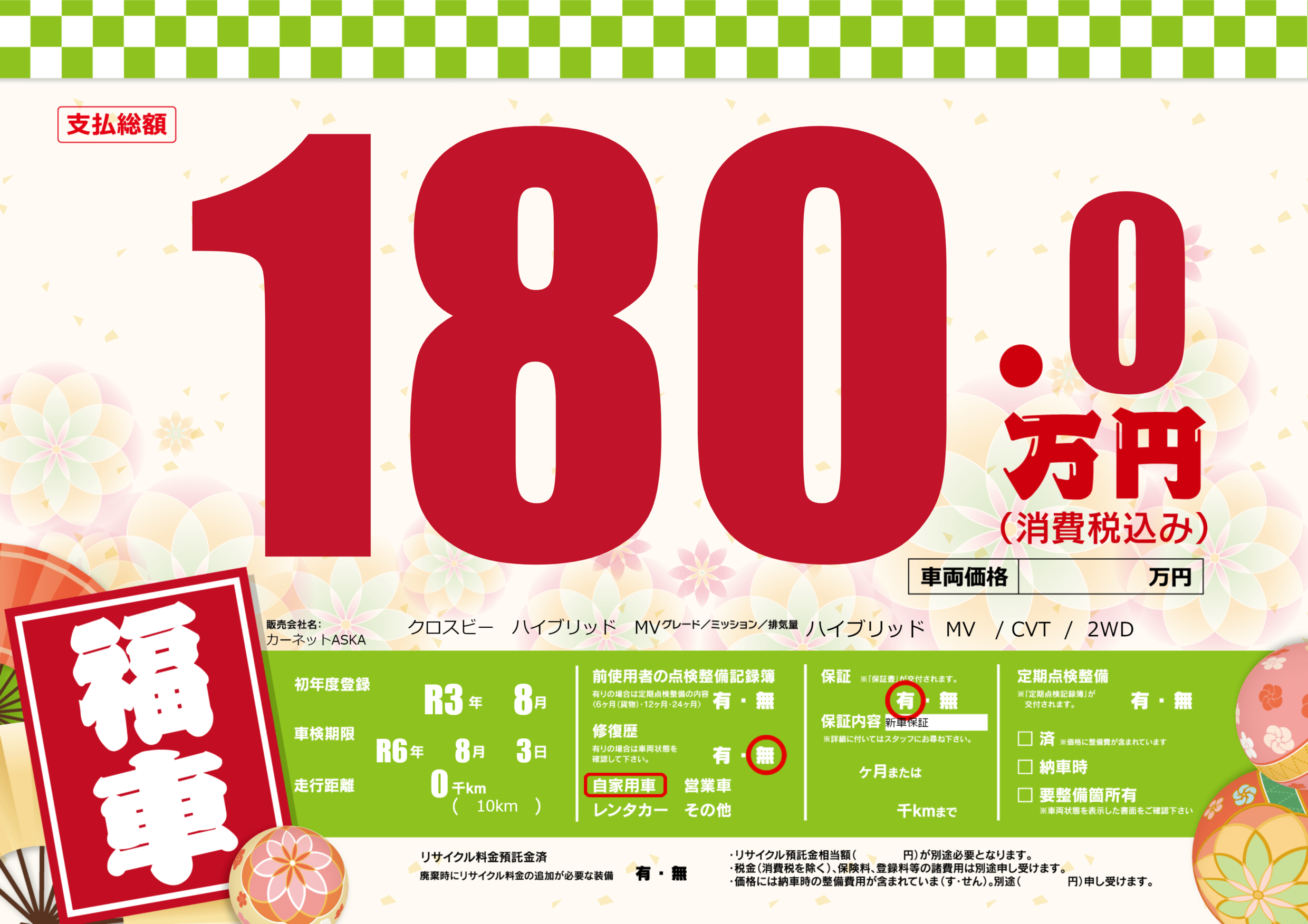 保証付き 保証内容(新車保証) ---ヶ月または()千kmまで |