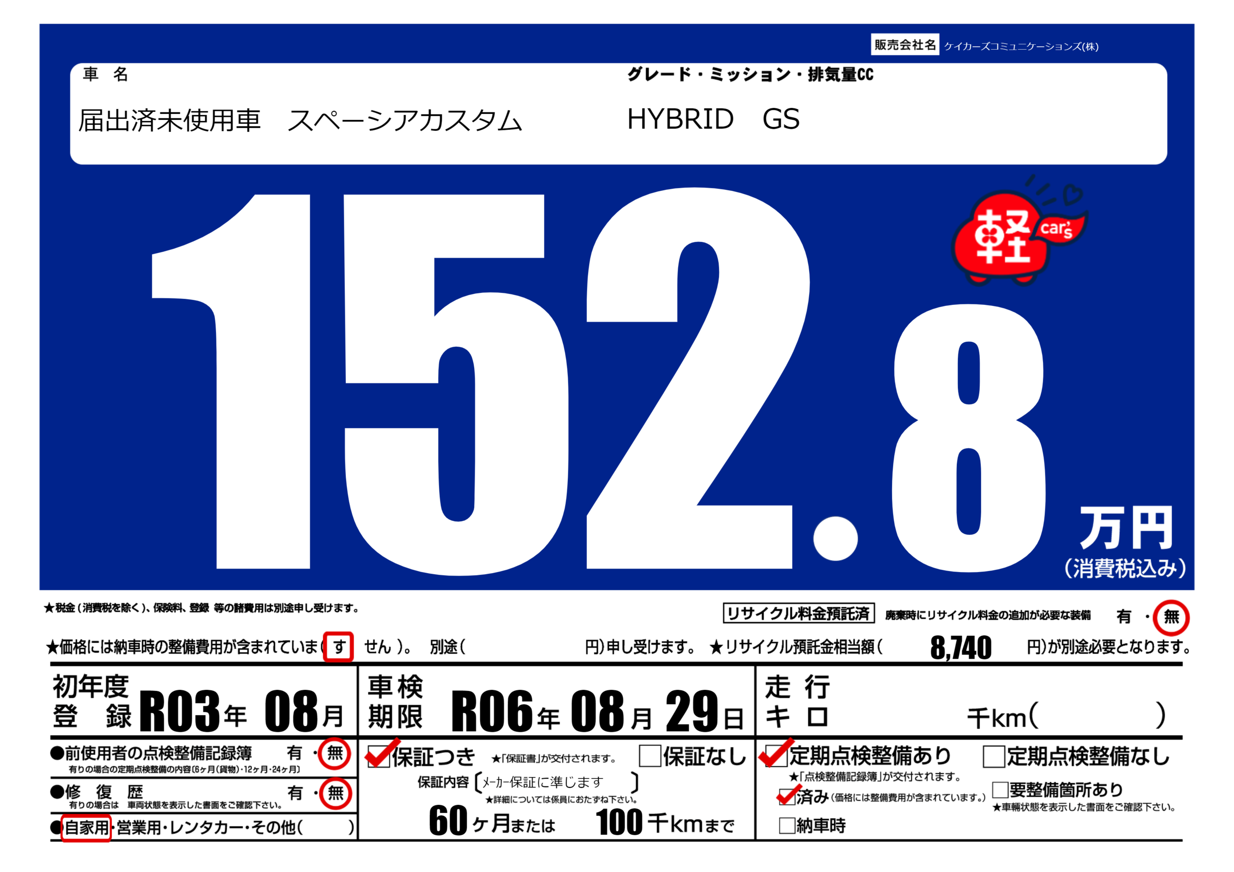 | 車名 | 届出済未使用車 スペーシアカスタム | グレード ミッション 排気量 |