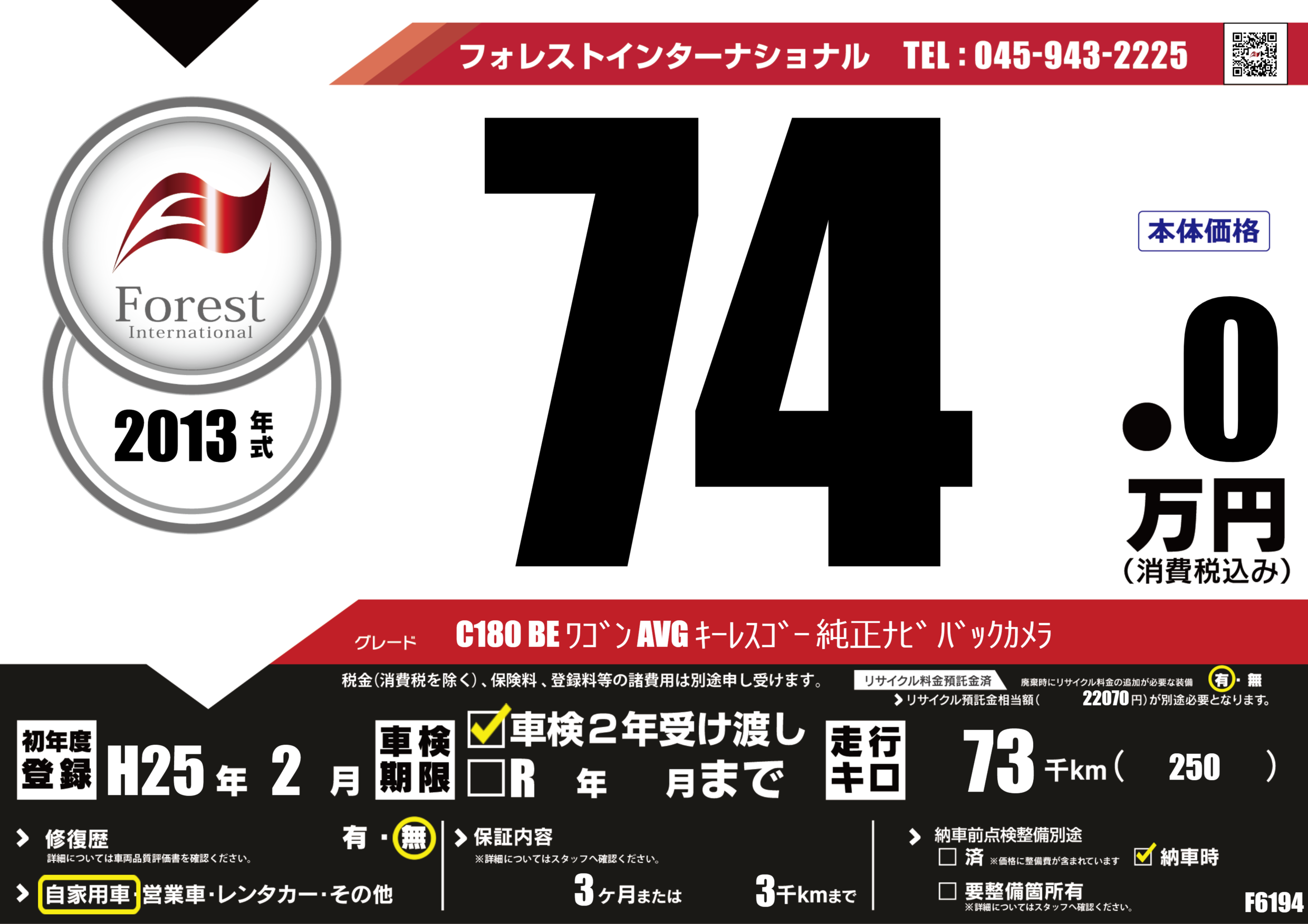 | 走行キロ | 7.3万km | 初年度登録 | H25年2月 |