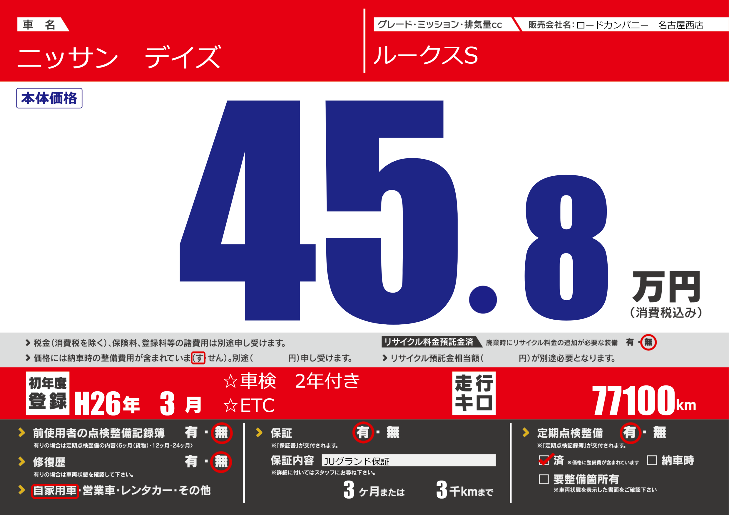 | 定期点検整備 | 定期点検整備あり 定期点検整備済み | ||