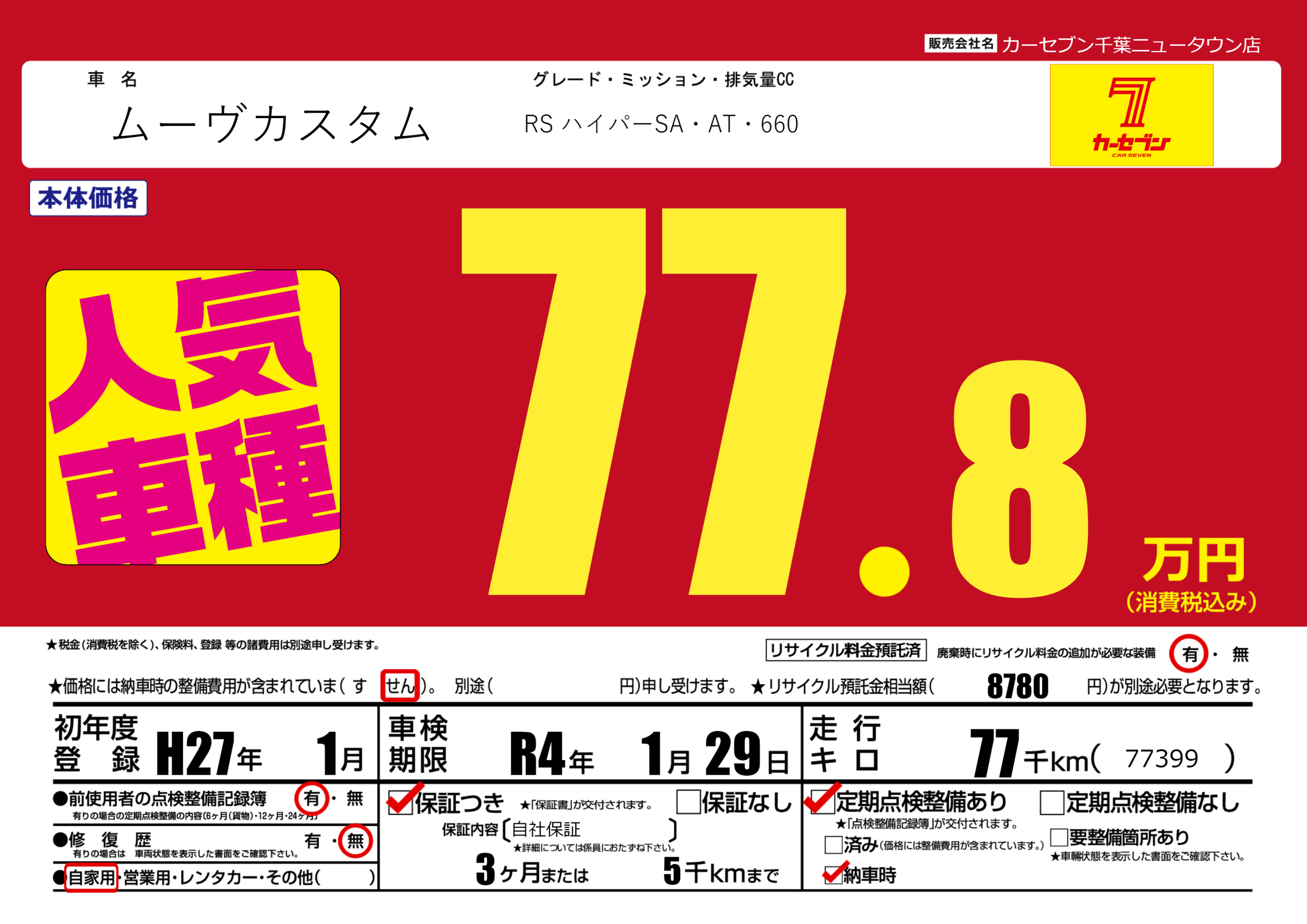 | 走行キロ | 7.7万km | 初年度登録 | H27年1月 |