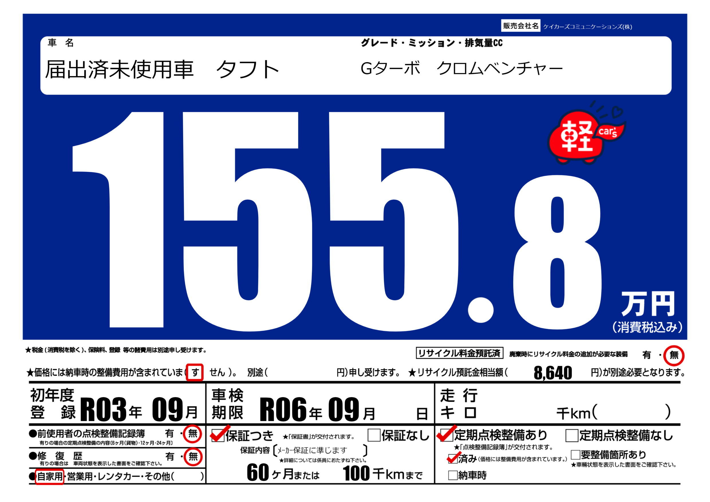 | 車名 | 届出済未使用車 タフト | グレード ミッション 排気量 |