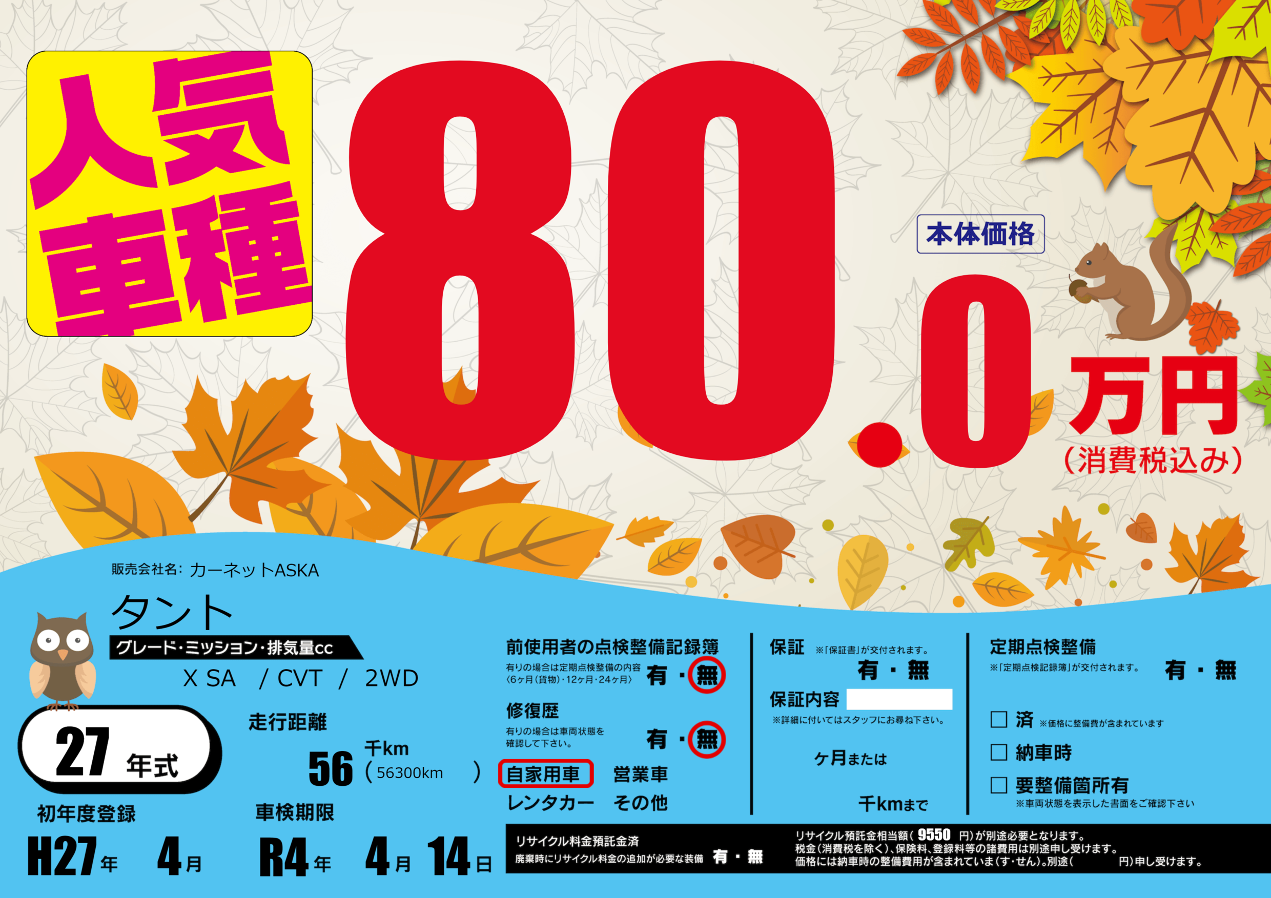 | 走行キロ | 5.6万km | 初年度登録 | H27年4月 |