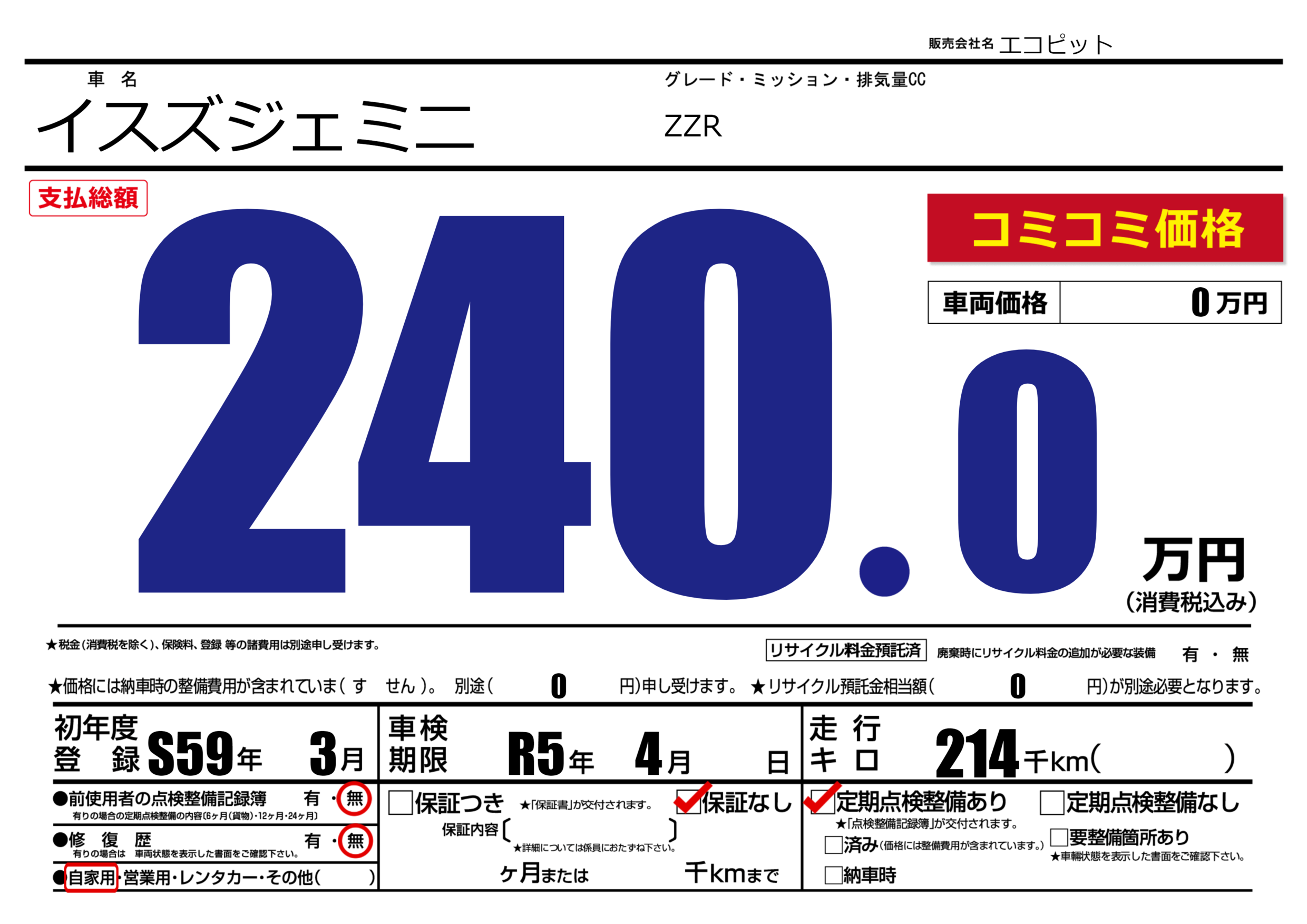 なし | 車検制限 | R5年4月---月 |