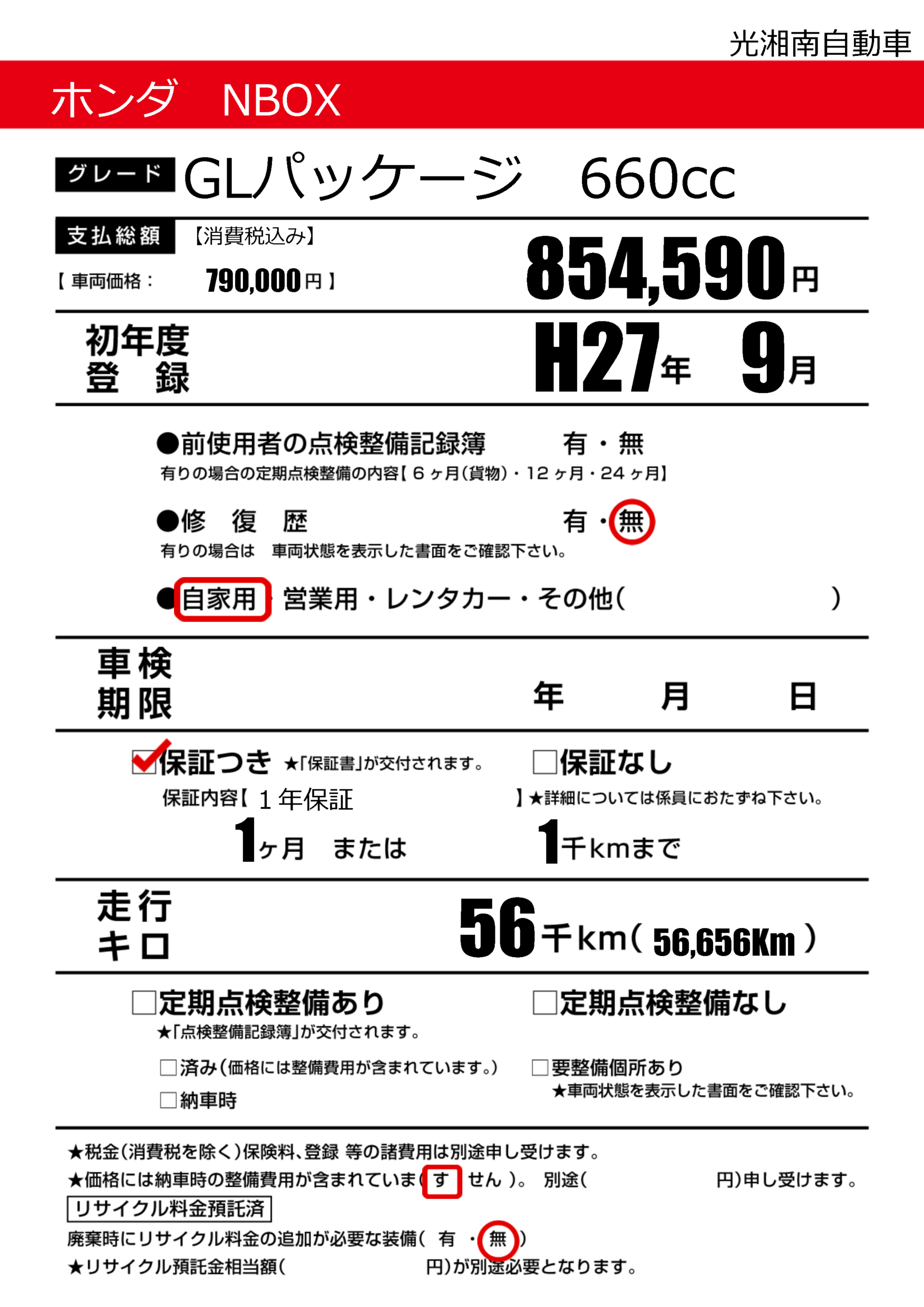 | 車名 | ホンダ NBOX | グレード ミッション 排気量 |