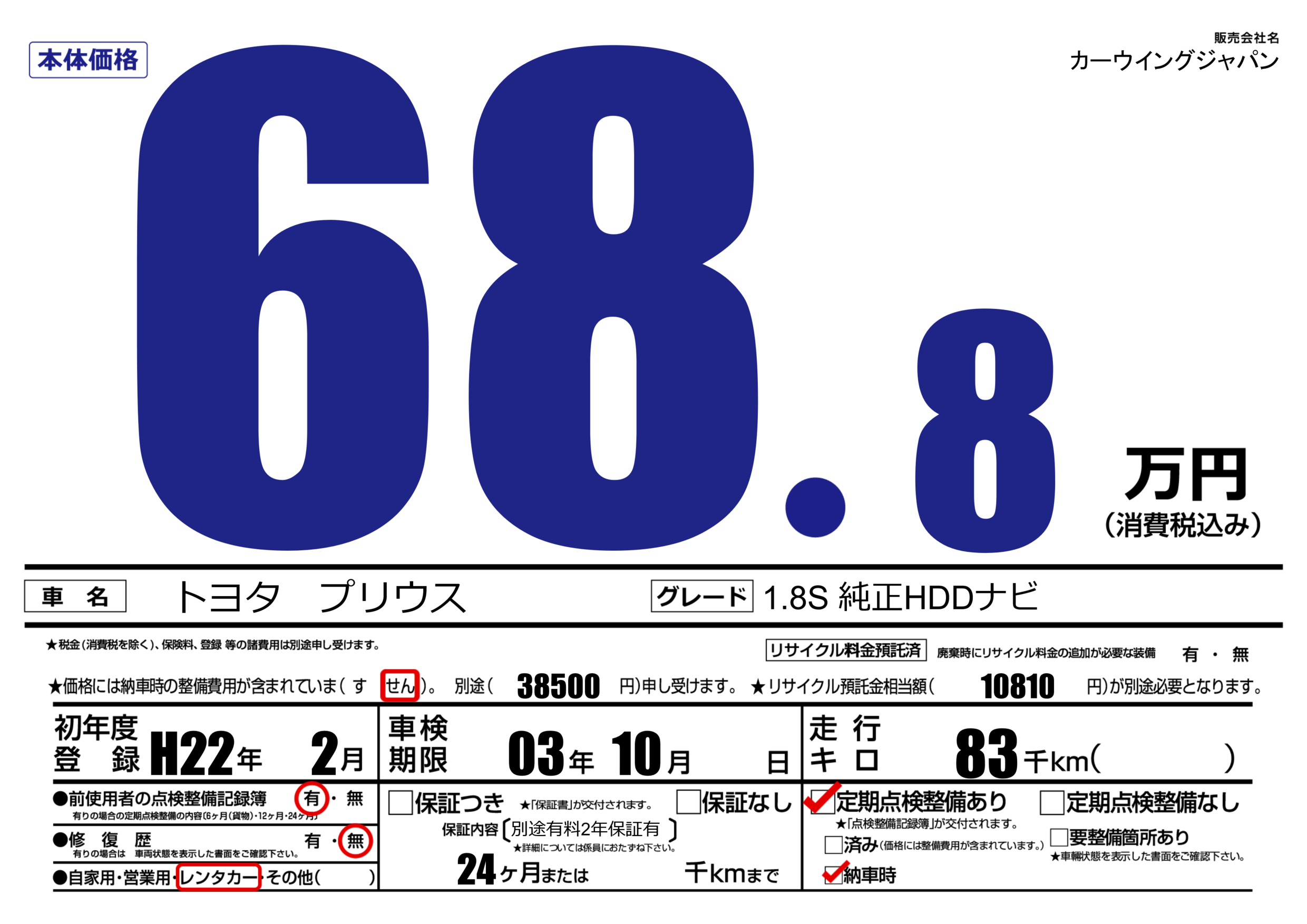 保証なし 保証内容(別途有料2年保証有) 24ヶ月または()千kmまで |