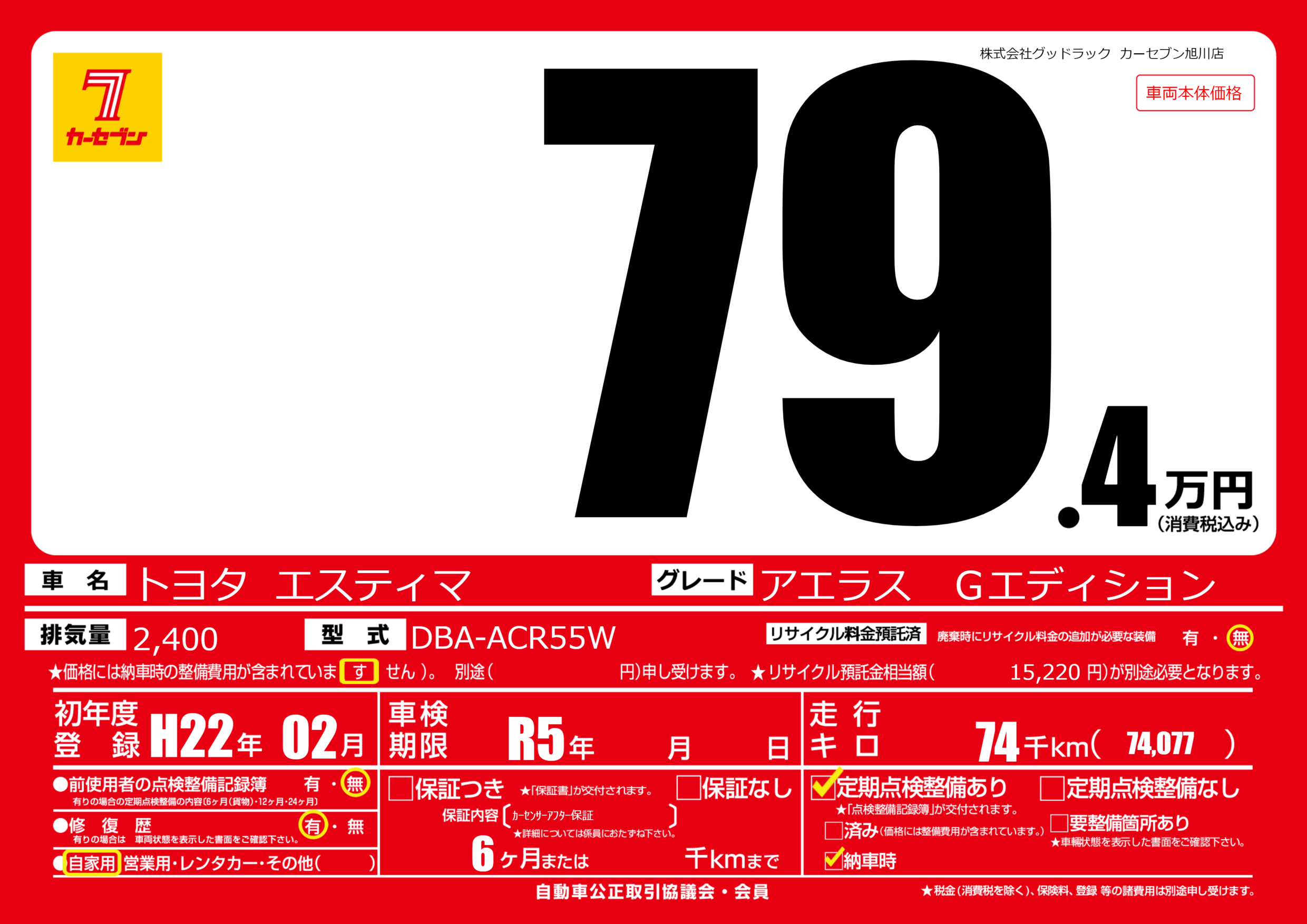 | 走行キロ | 7.4万km | 初年度登録 | H22年02月 |