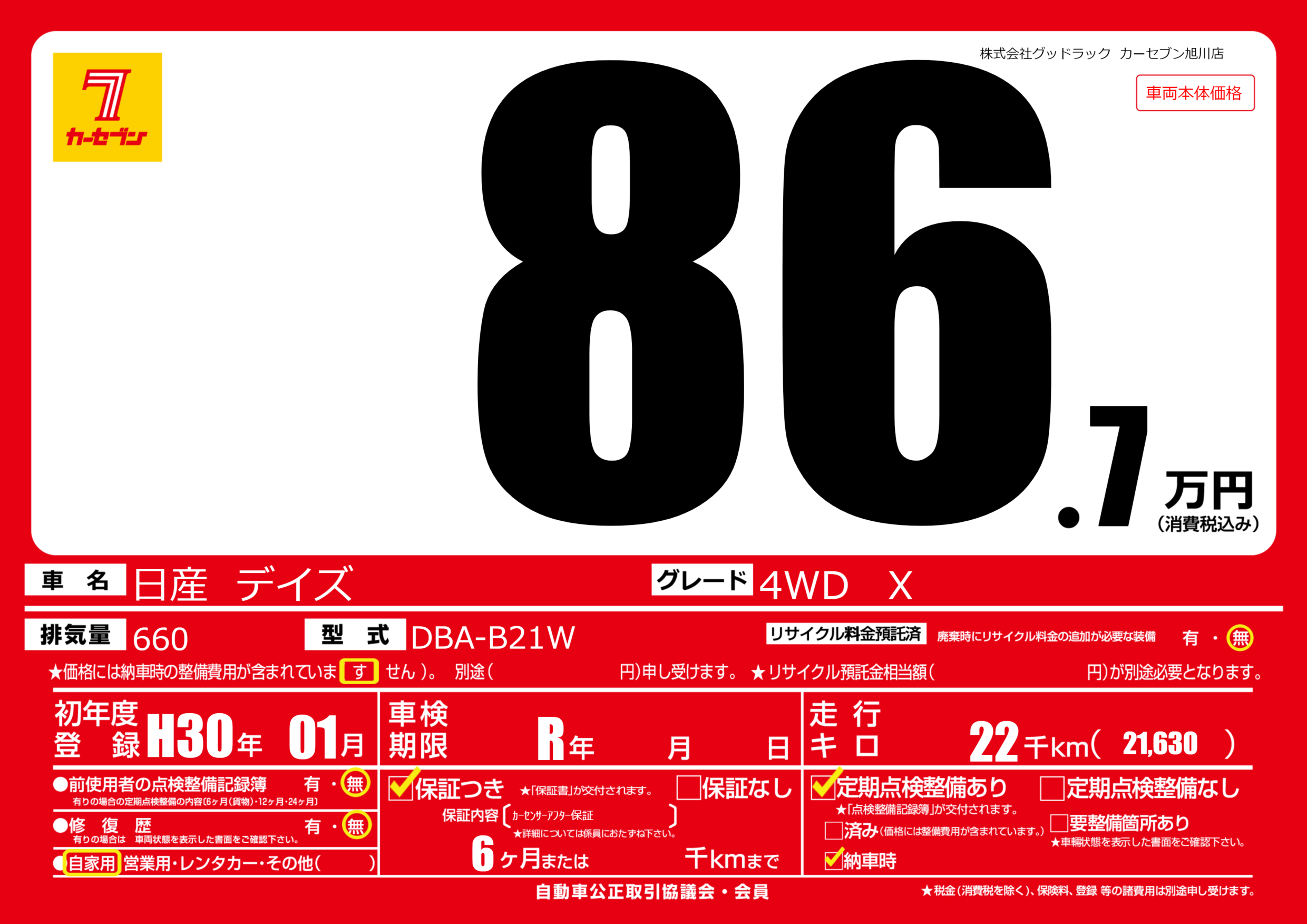 | 車名 | 日産 デイズ | グレード ミッション 排気量 |