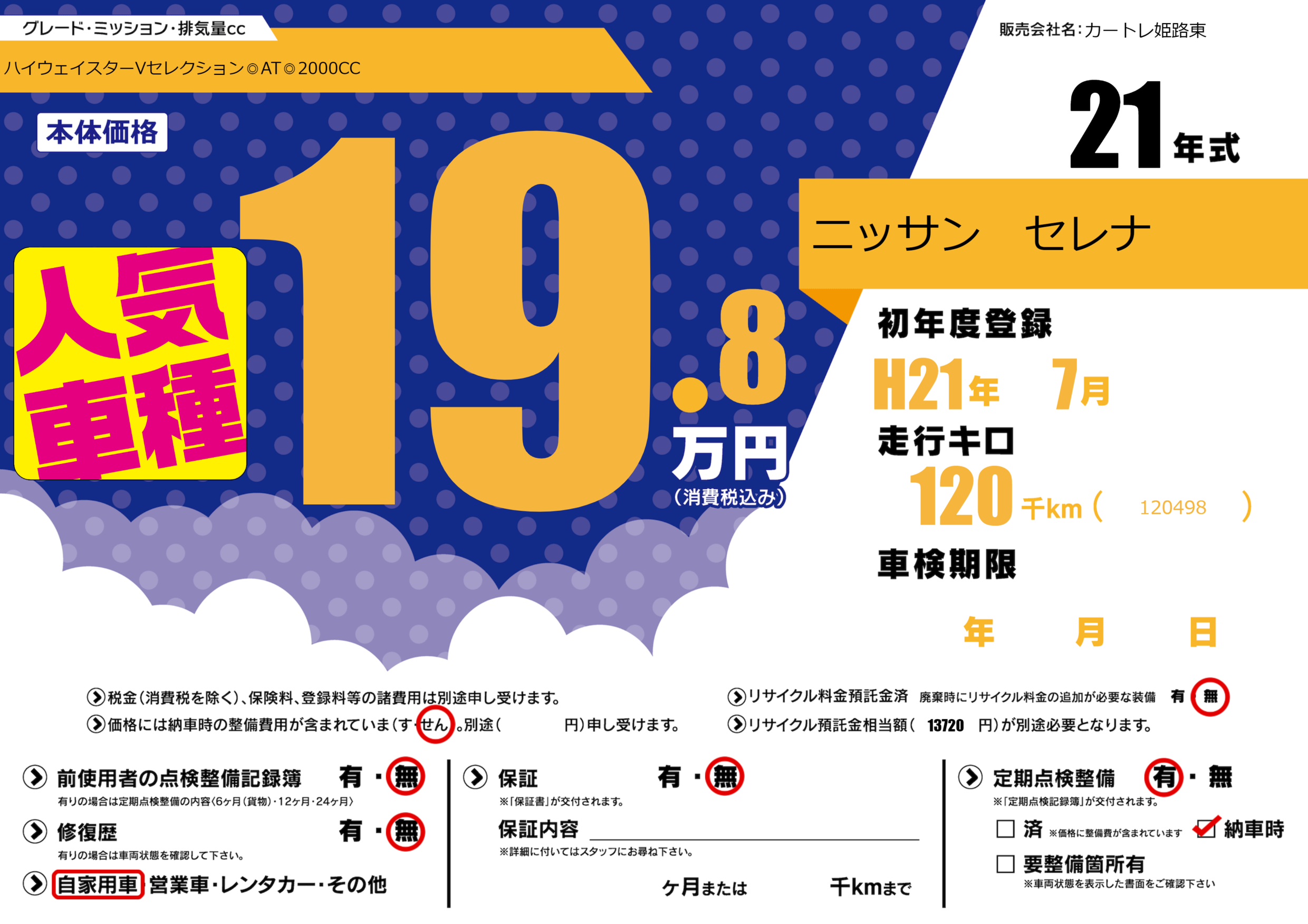 | 走行キロ | 12万km | 初年度登録 | H21年7月 |