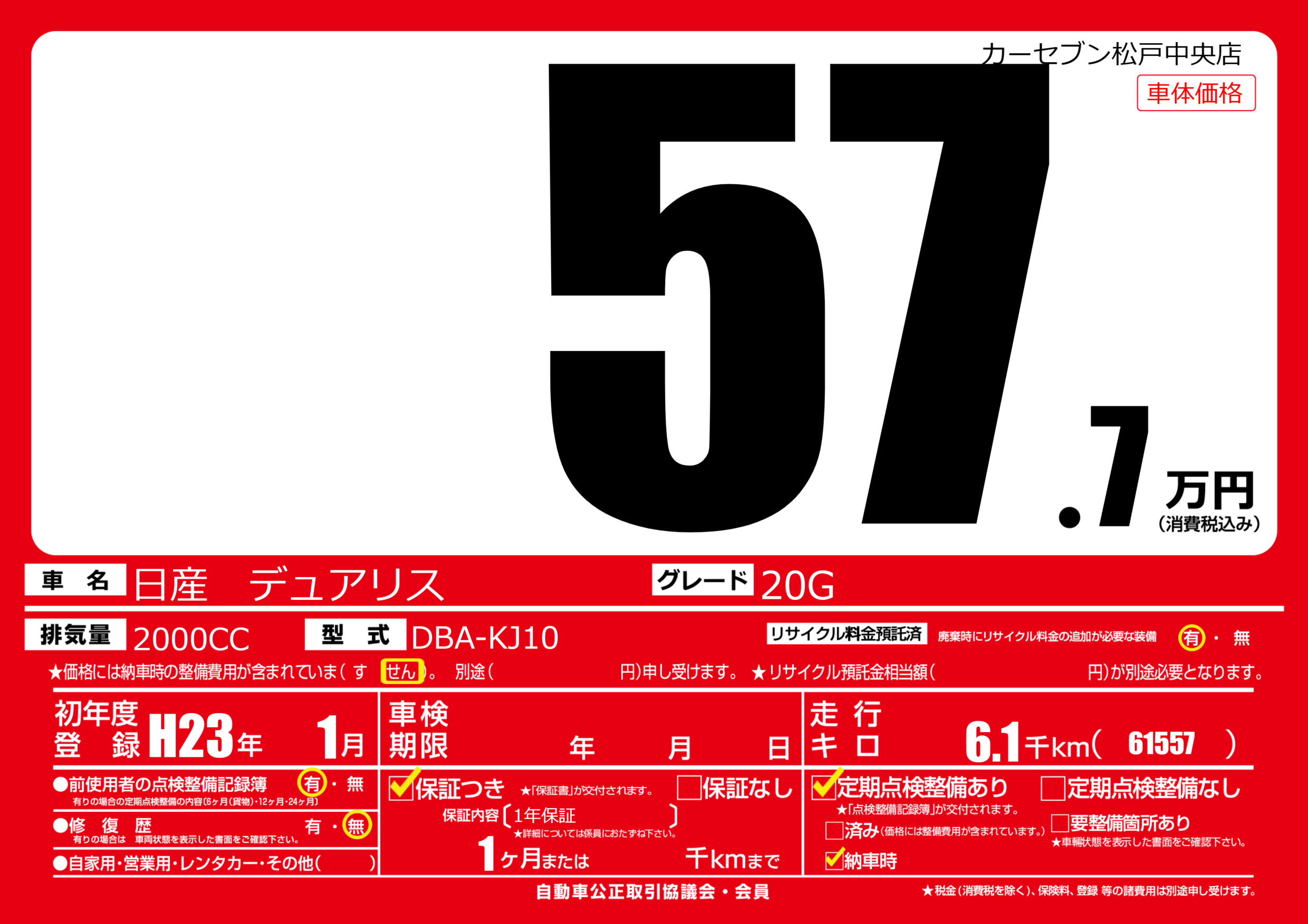 | 車名 | 日産 デュアリス | グレード ミッション 排気量 |