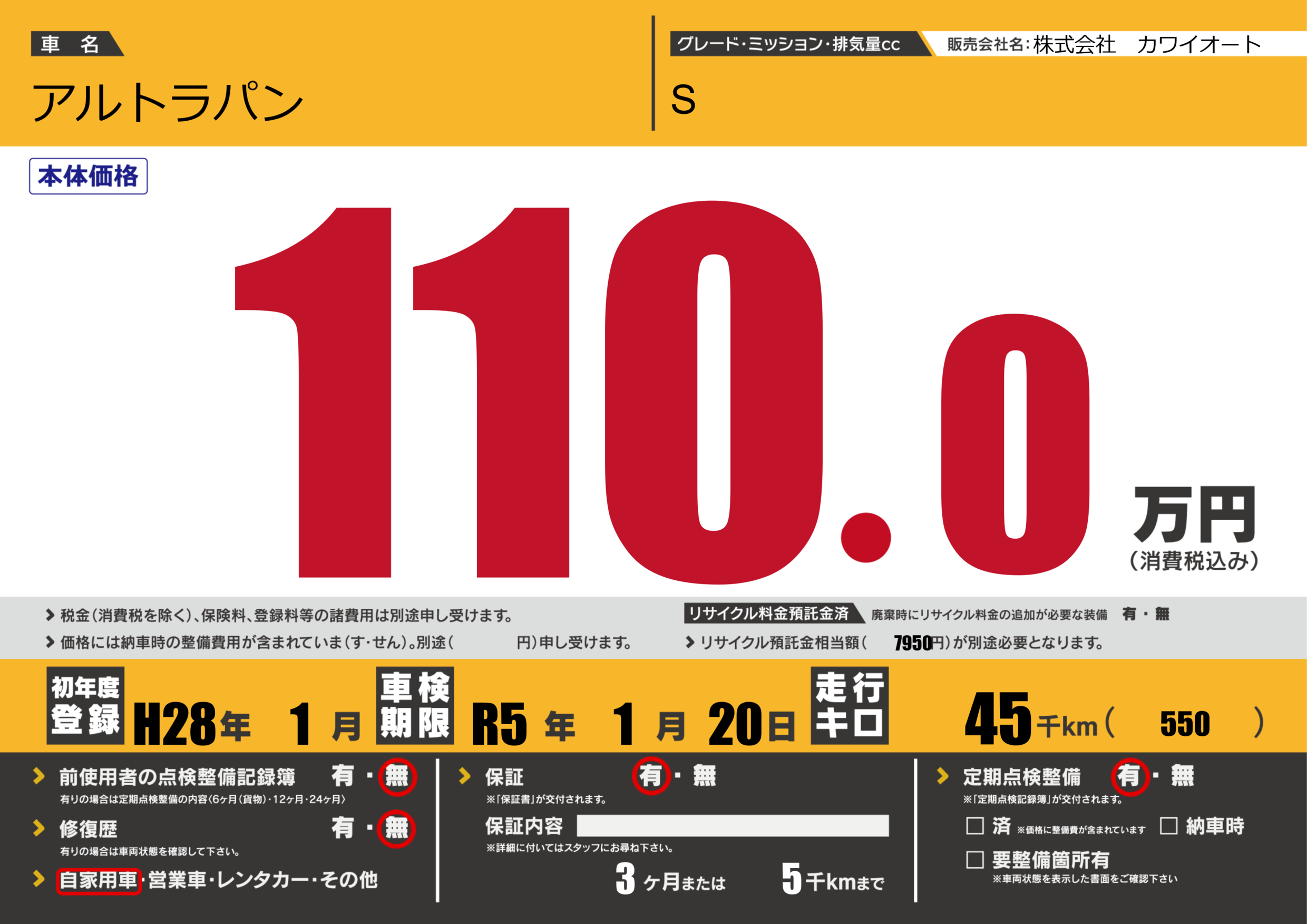 | 走行キロ | 4.5万km | 初年度登録 | H28年1月 |
