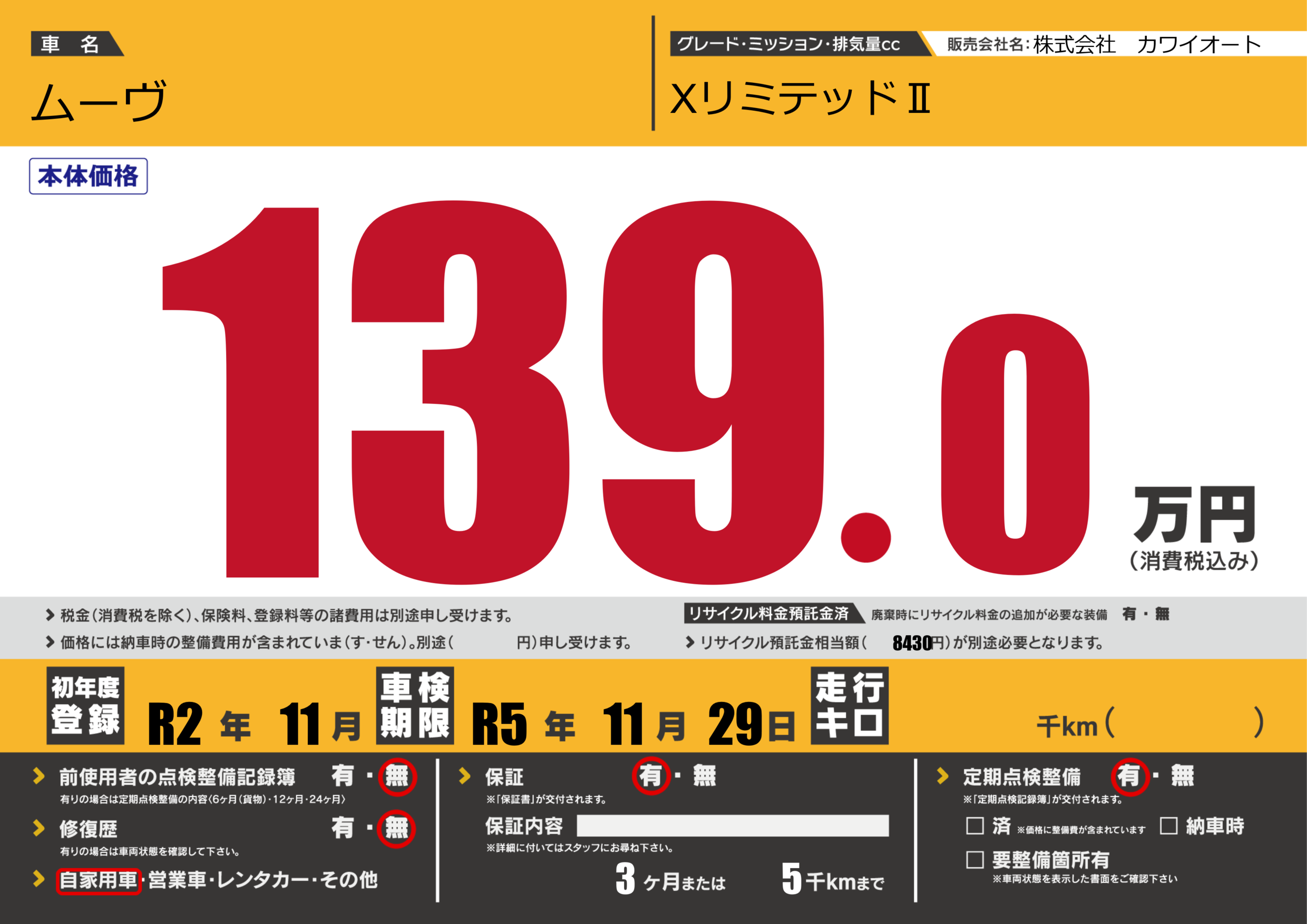 なし | 車検制限 | R5年11月29月 |
