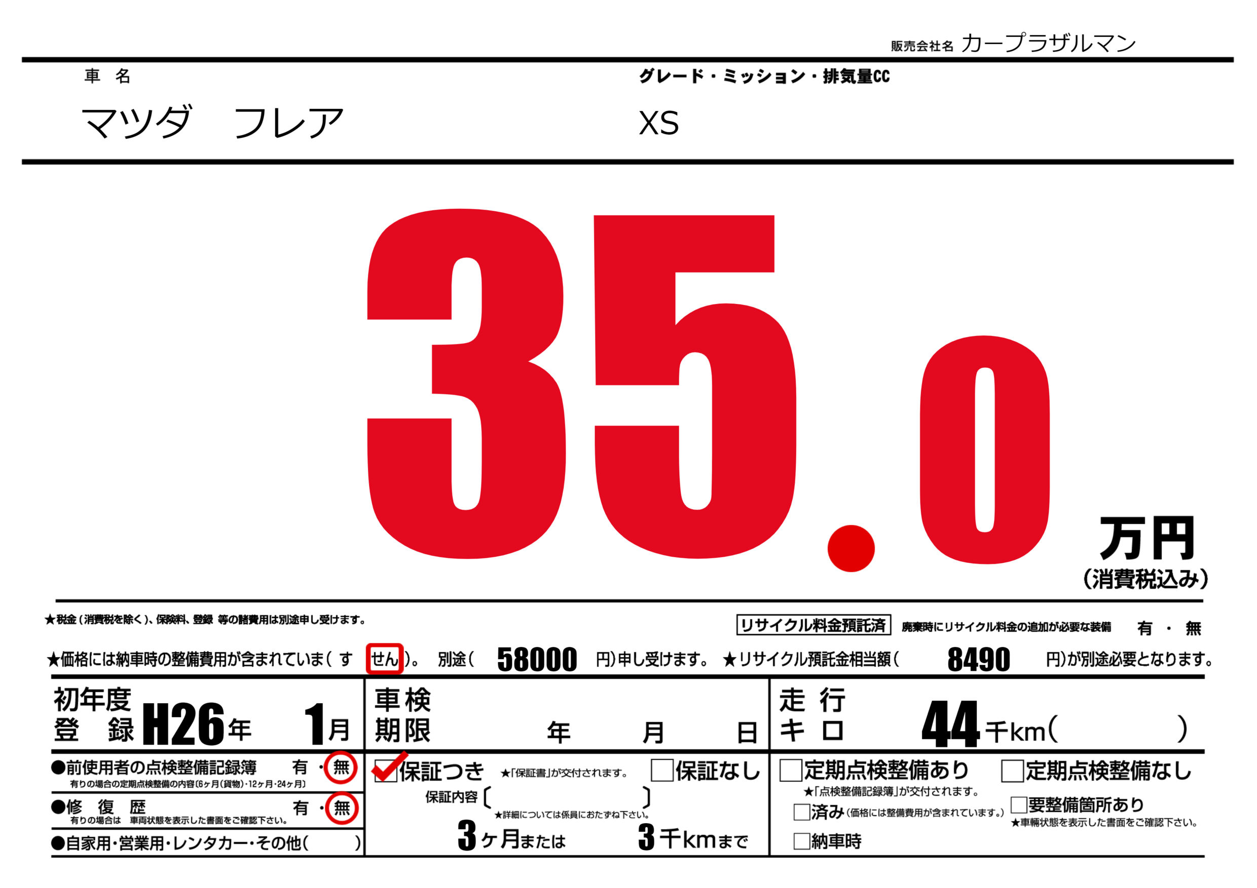 | 車名 | マツダ フレア | グレード ミッション 排気量 |