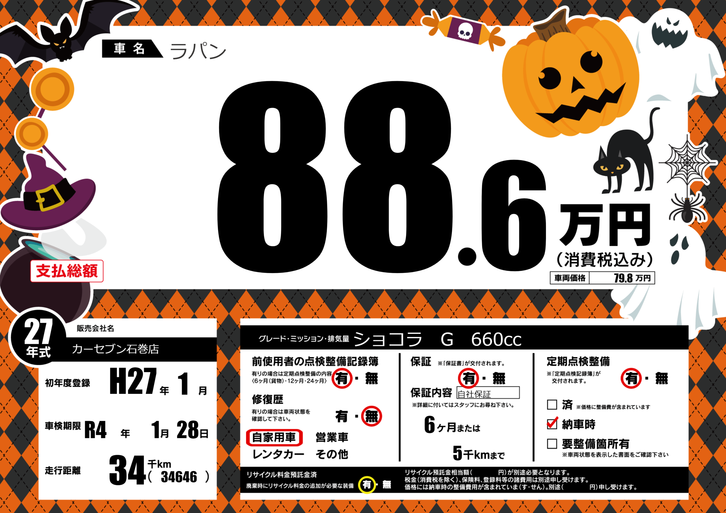 | 走行キロ | 3.4万km | 初年度登録 | H27年1月 |