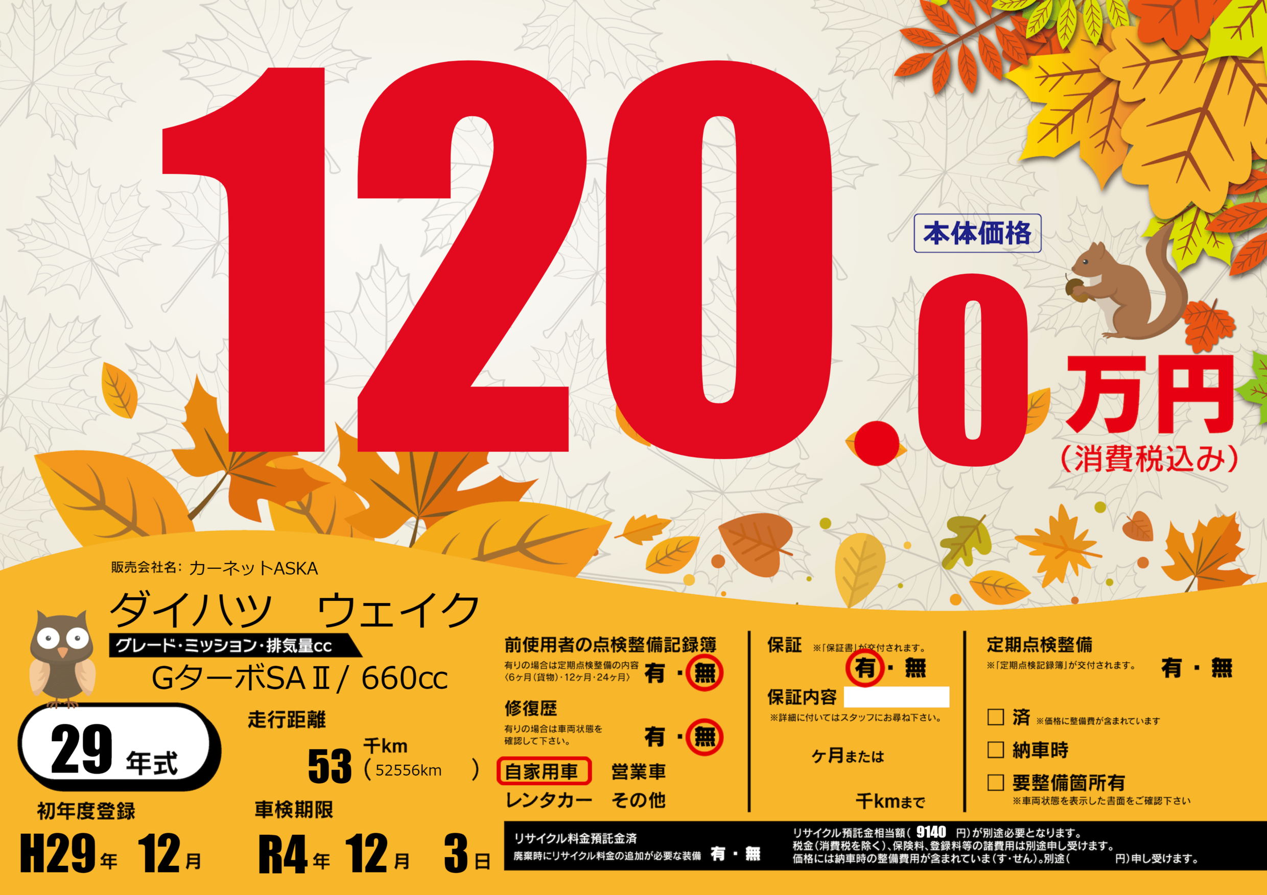 | 車名 | ダイハツ ウェイク | グレード ミッション 排気量 |