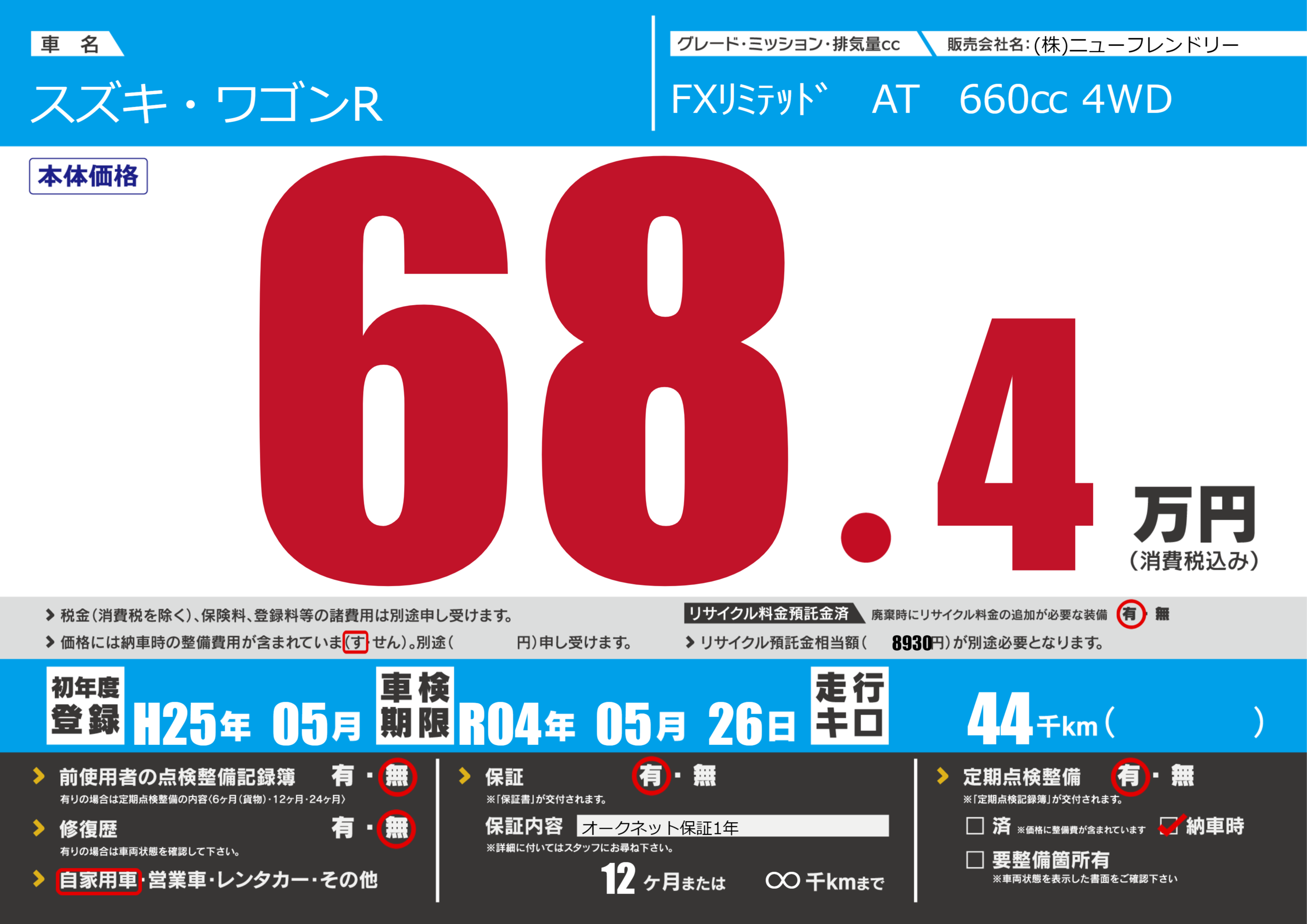 | 車名 | スズキ・ワゴンR | グレード ミッション 排気量 |