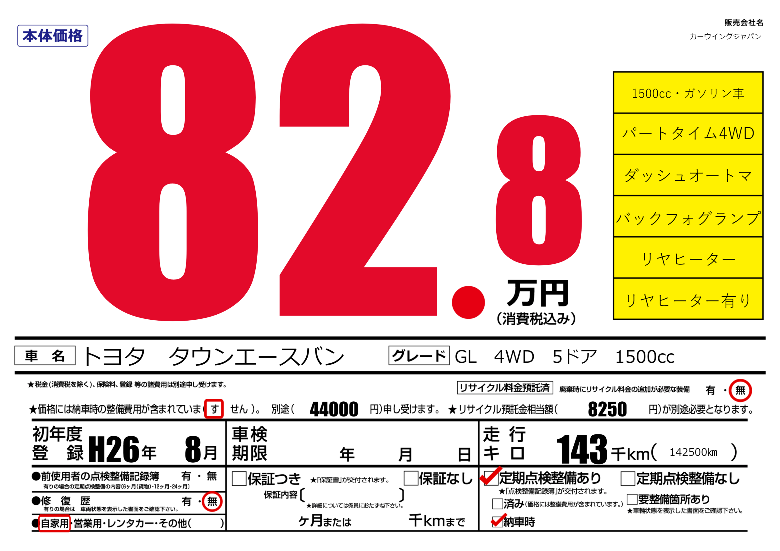 | 車名 | トヨタ タウンエースバン | グレード ミッション 排気量 |