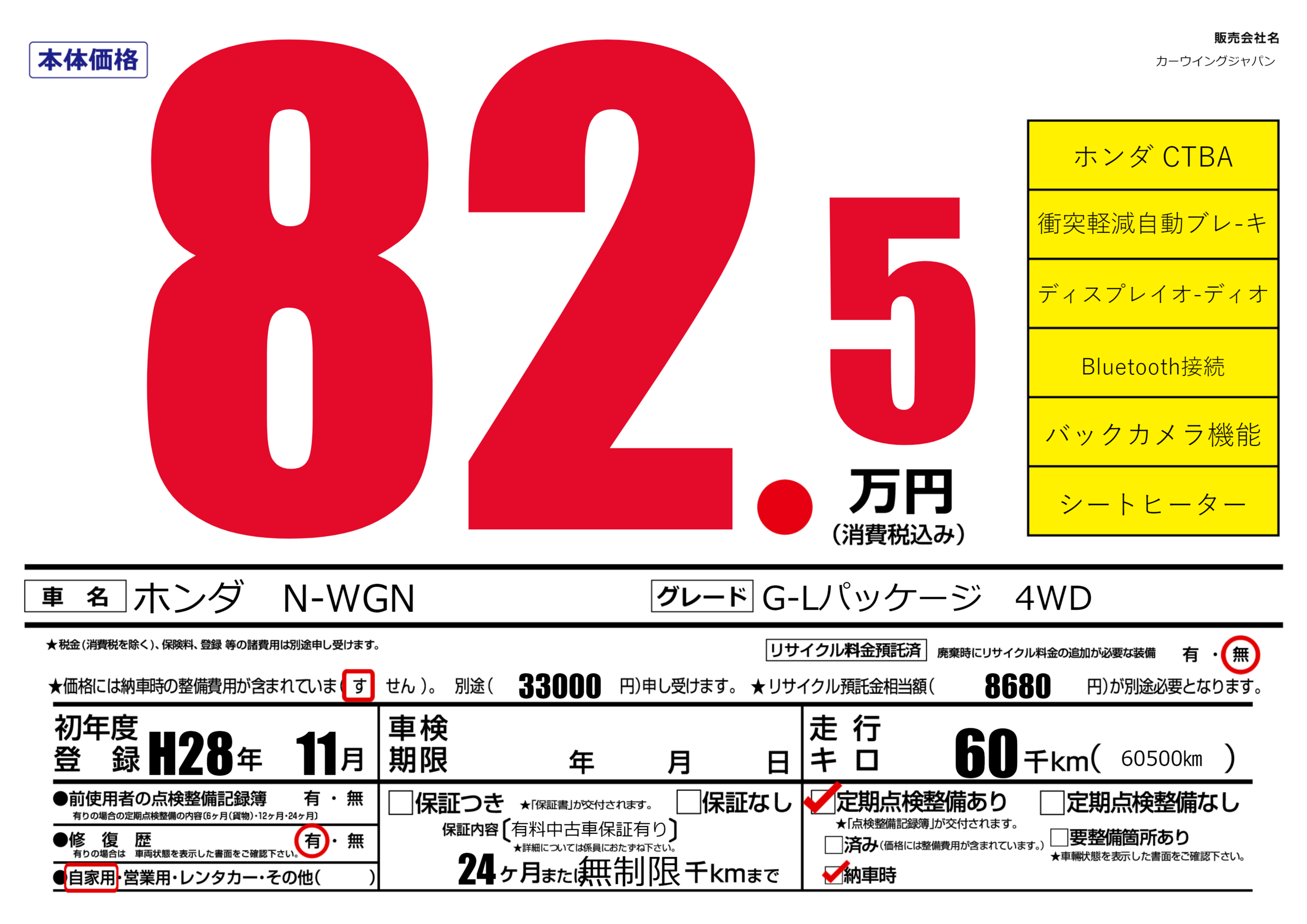 | 車名 | ホンダ N-WGN | グレード ミッション 排気量 |