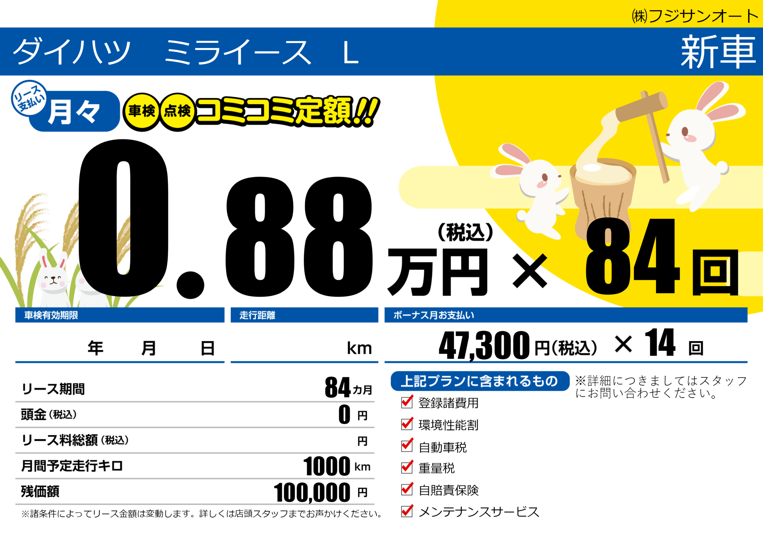 | 車名 | ダイハツ ミライース L | グレード ミッション 排気量 |