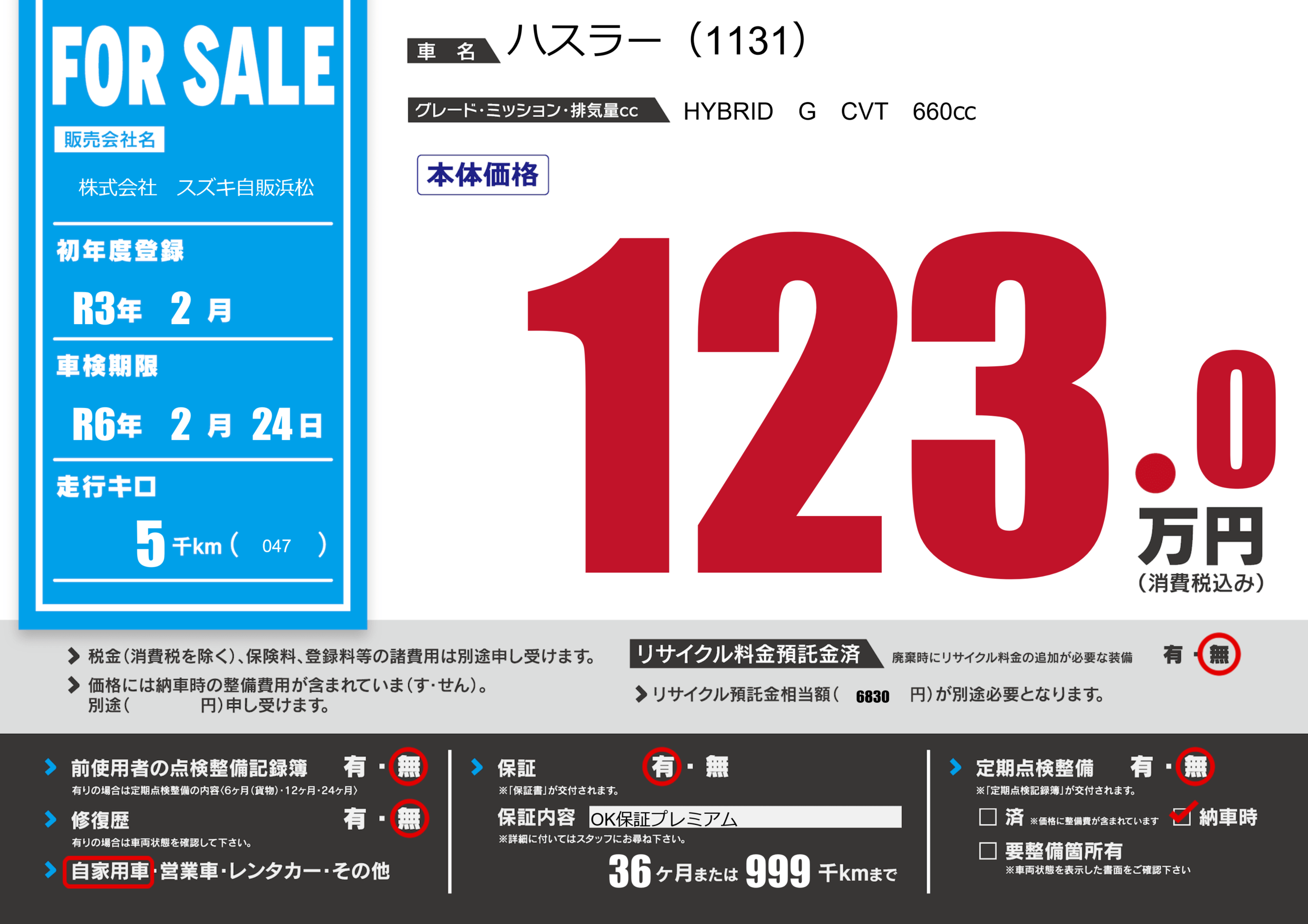 | 車名 | ハスラー(1131) | グレード ミッション 排気量 |