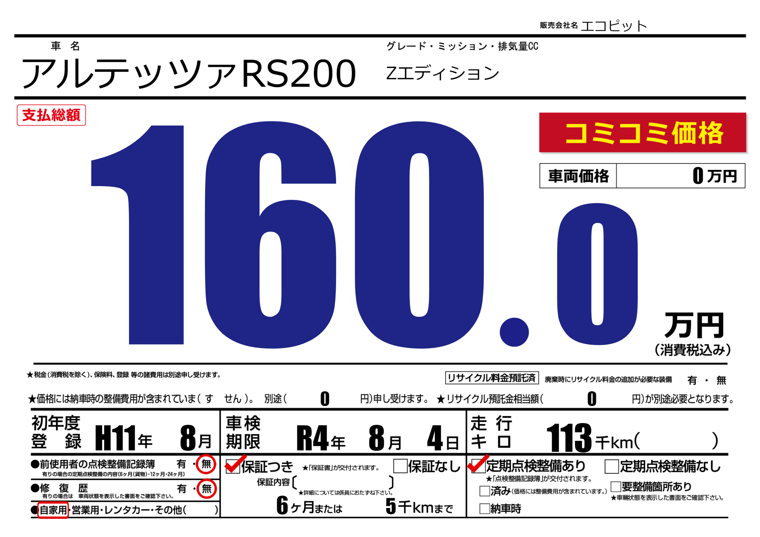 保証付き 保証内容(---) 6ヶ月または(5)千kmまで |