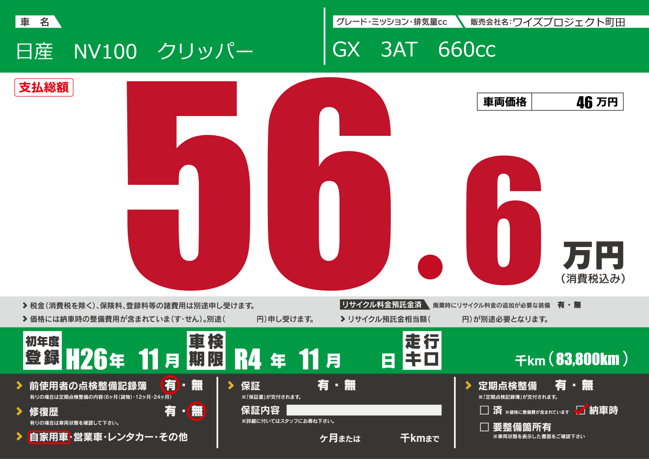 なし | 車検制限 | R4年11月---月 |