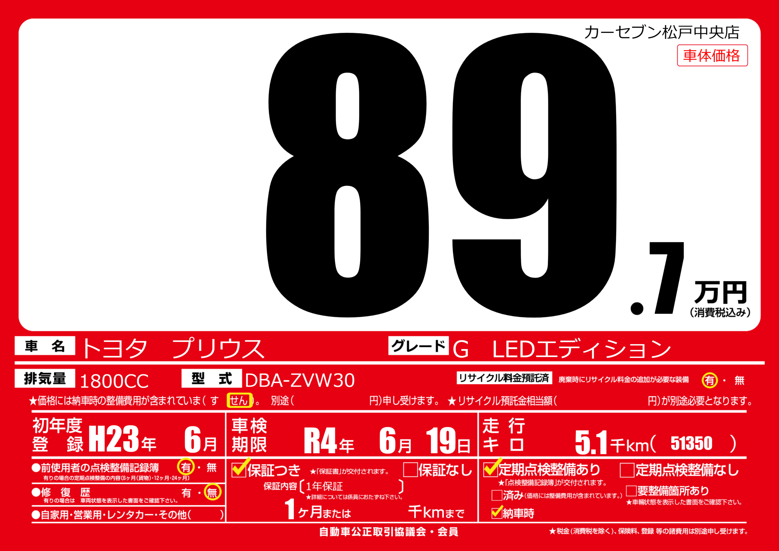 | 車名 | トヨタ プリウス | グレード ミッション 排気量 |