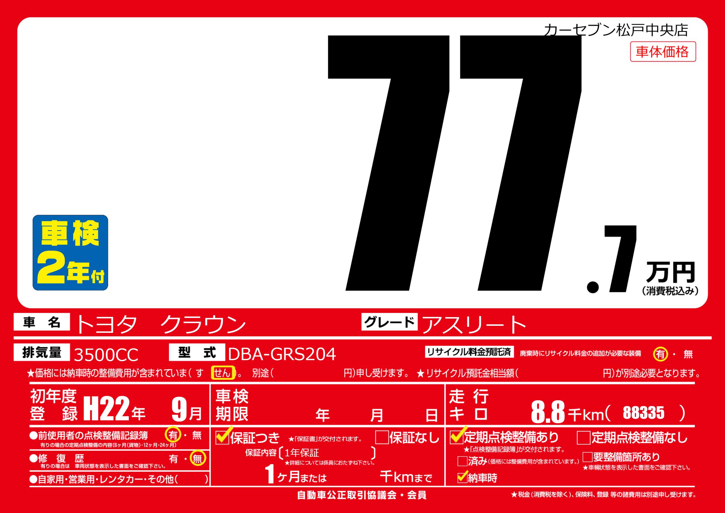 | 車名 | トヨタ クラウン | グレード ミッション 排気量 |