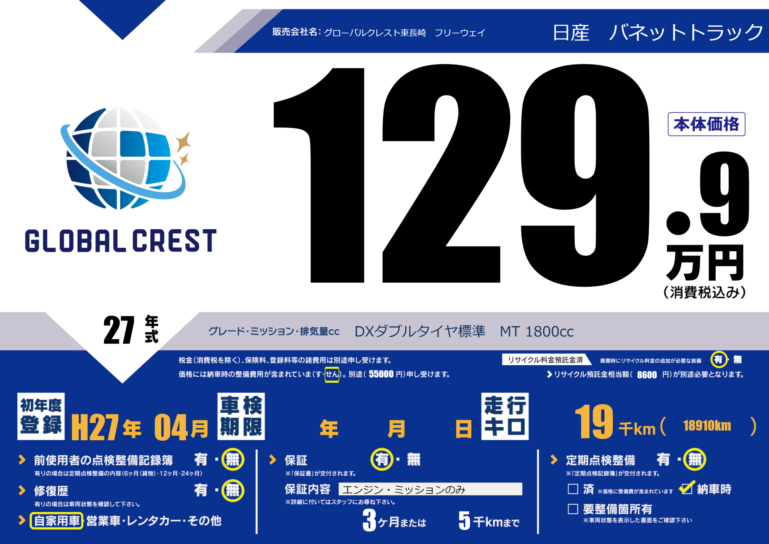 | 車名 | 日産 バネットトラック | グレード ミッション 排気量 |