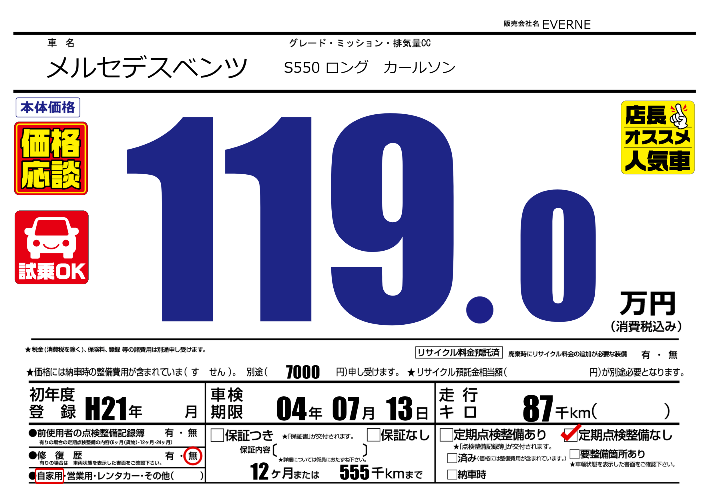 | 車名 | メルセデスベンツ | グレード ミッション 排気量 |