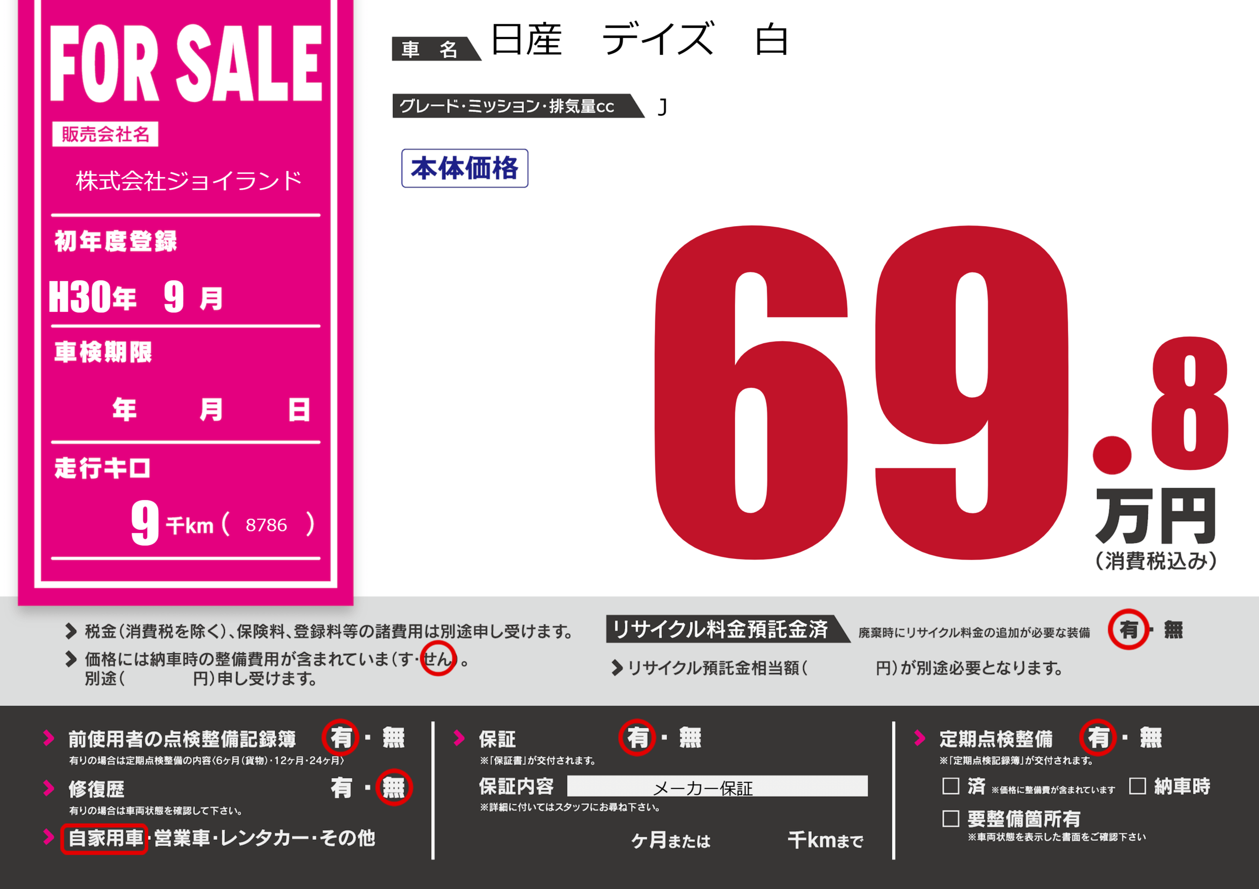 | 車名 | 日産 デイズ 白 | グレード ミッション 排気量 |
