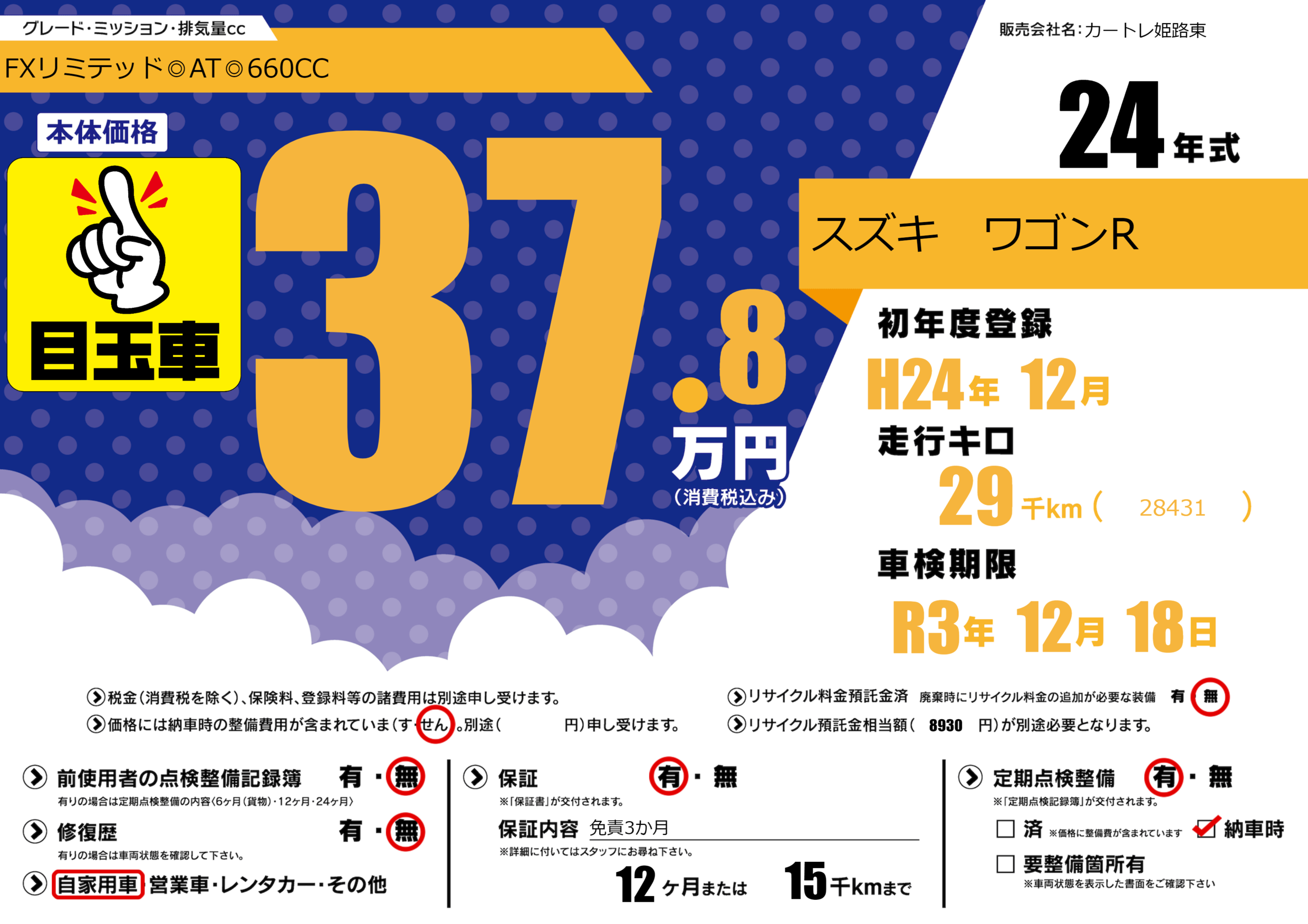| 車名 | スズキ ワゴンR | グレード ミッション 排気量 |