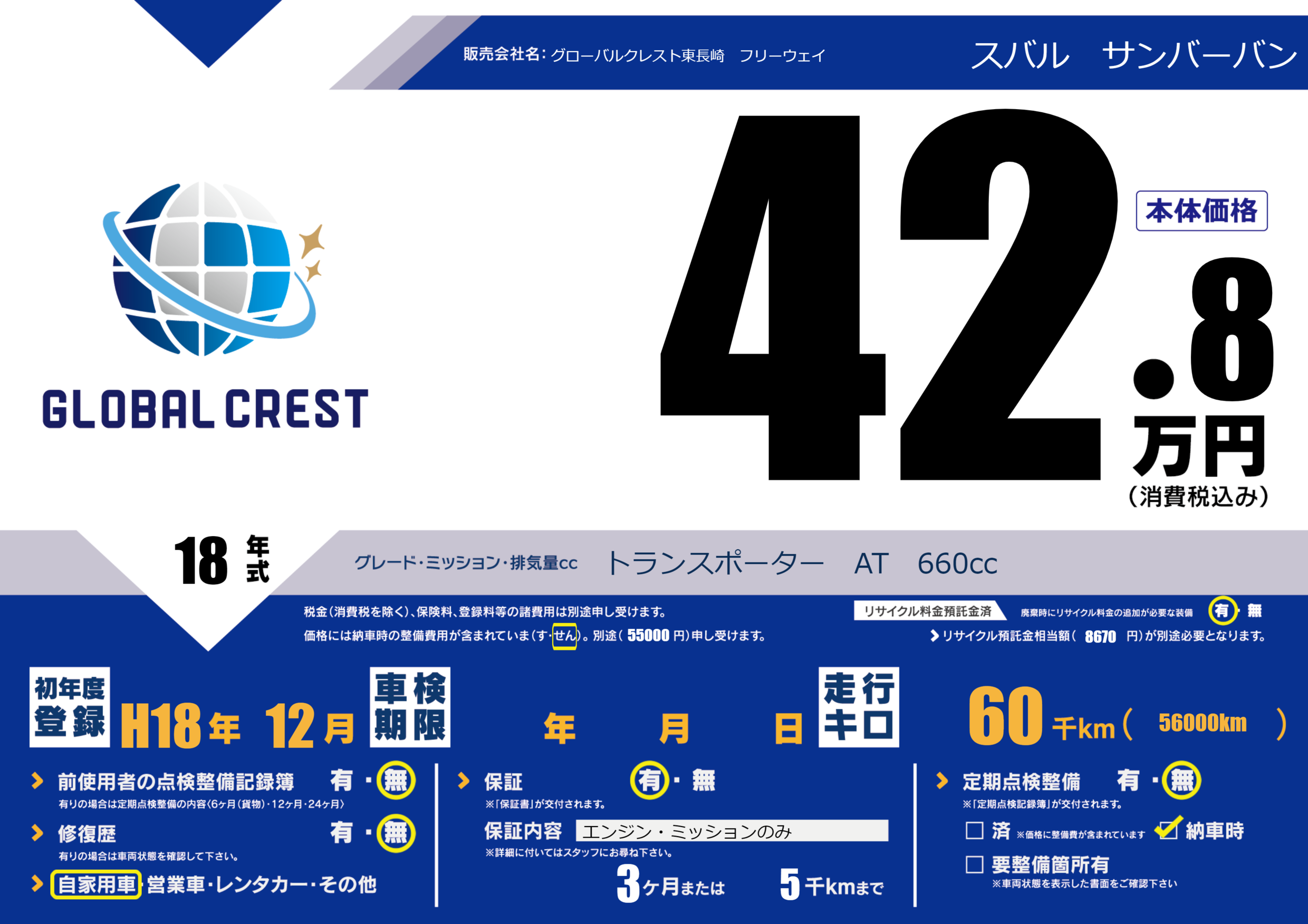| 車名 | スバル サンバーバン | グレード ミッション 排気量 |