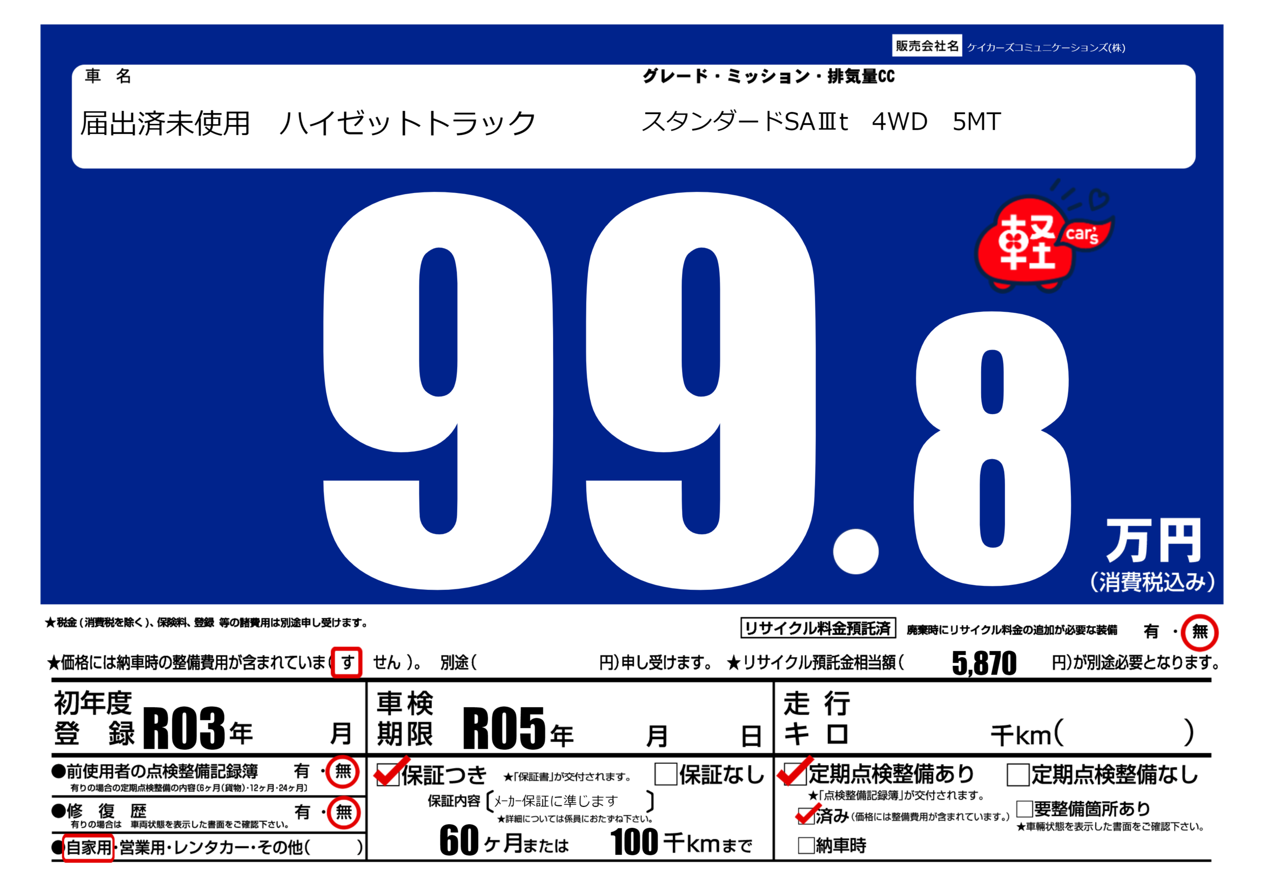 | 定期点検整備 | 定期点検整備あり 定期点検整備済み | ||